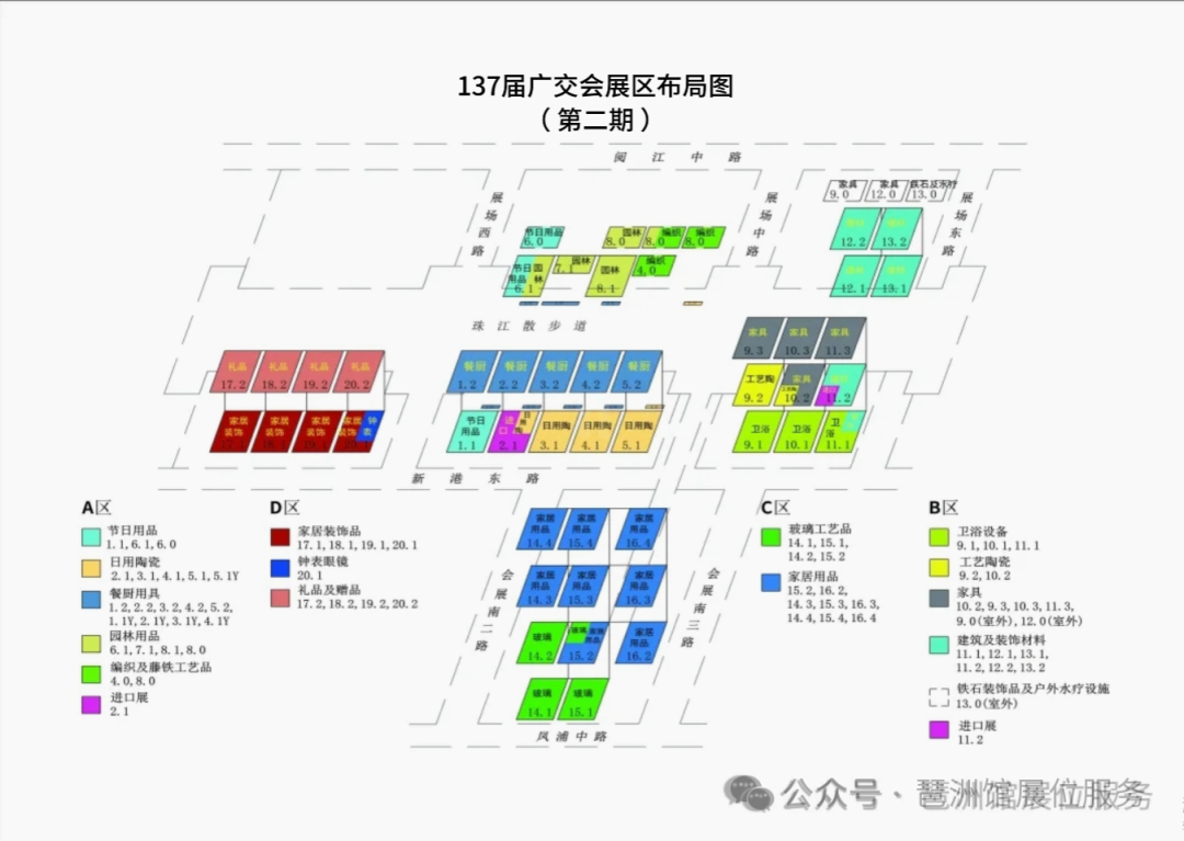 本届广交会展馆位于广州市海珠区琶洲岛,共设置13个板块55个展区,各展区分布明确,方便参展商和采购商快速定位: