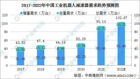 工业机器人行业的需求大幅增长,存量替换需求同步提升,大部分减速器厂商均迎来业绩的增长。GGII数据显示,2021年中国工业机器人减速器总需求量为93.11万台,同比增长78.06%。其中增量需求82.41万台,同比增长95.05%;存量替换量为10.70万台,同比增长6.57%。随着数字化进程的加快推进,机器换人将受益其中,预计未来几年减速器市场增长的确定性进一步增强,到2026年市场总需求量有望超过270万台。