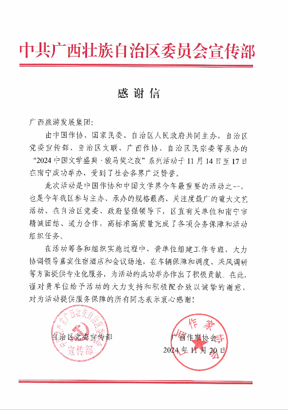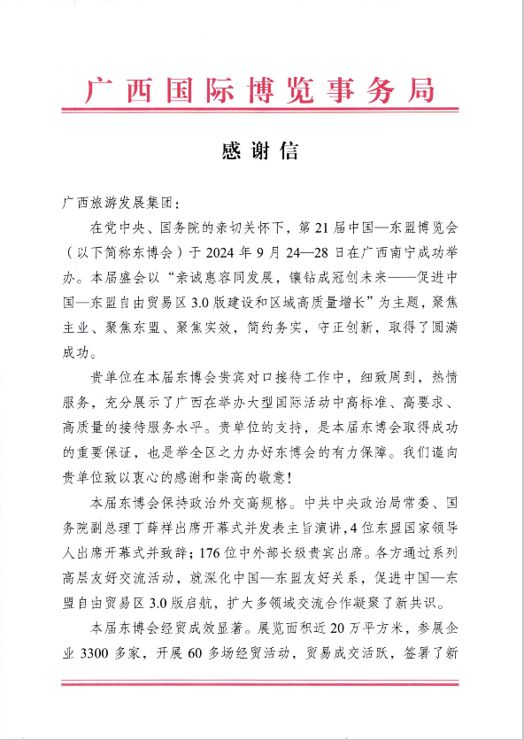 近日,广西国际博览事务局、自治区党委宣传部及广西作家协会相继发来感谢信,肯定了广旅集团在第21届中国-东盟博览会(简称东博会)贵宾对口接待工作及“2024 中国文学盛典·骏马奖之夜”系列活动中所展现出的卓越服务能力和突出表现。