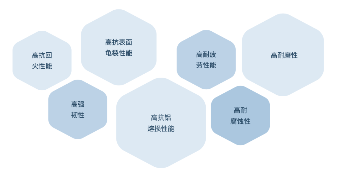 镭镆科技还带来了一款针对压铸行业自主研发的新一代3D打印热作模具钢,具有高韧性、高抗回火性、高抗表面龟裂性、高抗铝熔损性、高耐疲劳性、高耐腐蚀性和高耐磨性等特点。与传统的3D打印材料和压铸模具钢材相比,镭镆科技创新材料能够弥补材料性能不足的缺陷,显著延长压铸模具的使用寿命。