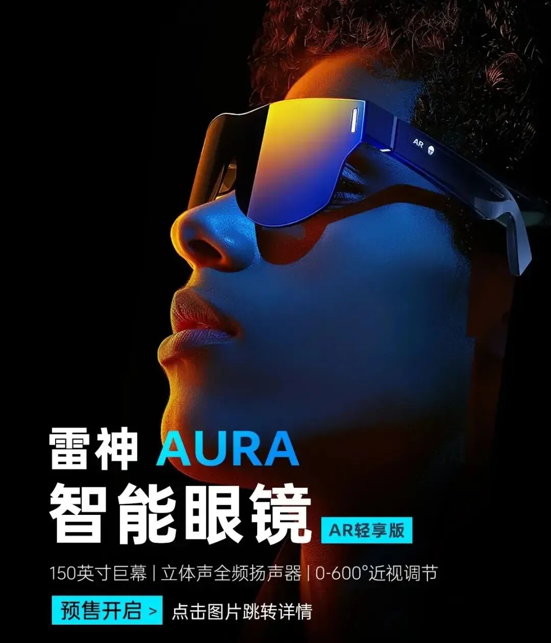 AR 轻享版是雷神科技在 CES 2025 的力作。它采用 Micro OLED + Birdbath 光学显示方案的分体式 XR 眼镜,仅重 79g。拥有 46° 视场角、支持 0-600 度的屈光调节、600 nits 入眼亮度,98% sRGB 色域覆盖,能投射出 150 英寸的震撼画面,立体声全频扬声器营造出环绕音效。该产品还可与主流游戏主机相连,为玩家开启全新游戏视角。此产品已在京东平台开启预售,预售价为 999 元。