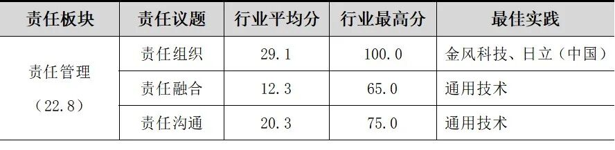 从责任管理的具体议题来看,机械设备制造业责任组织得分最高,为29.1分;责任沟通次之,为20.3分;责任融合得分最低,为12.3分。其中,金风科技和日立(中国)在责任组织维度得分达到100.0分(见表2)。