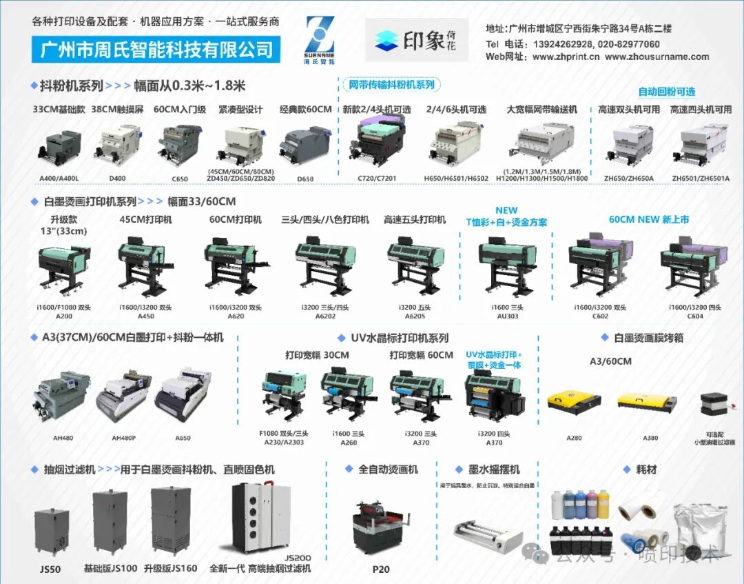 广州市周氏智能公司主要产品有:白墨烫画打印机、UV水晶标打印机、白墨烫画抖粉机、白墨打印抖粉一体机、旗帜布料固色机、抽烟过滤机 ,同时可按客户需求设计和生产配套设备。