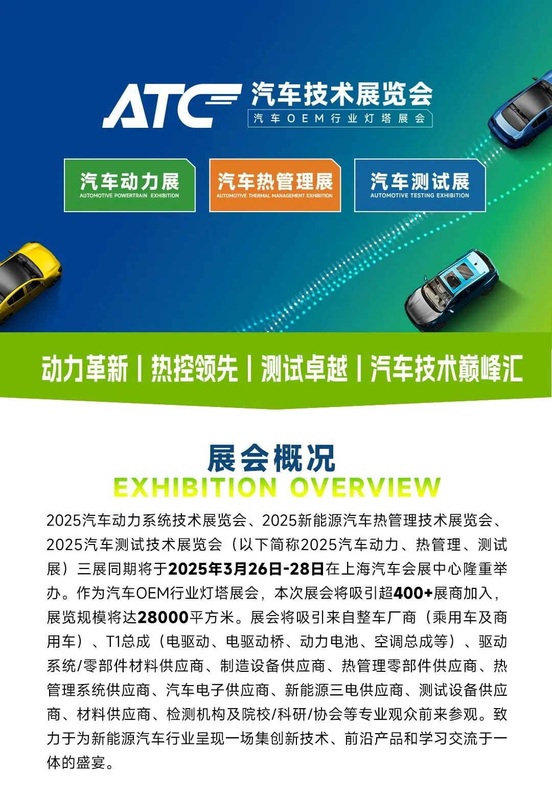 作为汽车OEM行业的灯塔展会,由上海国际汽车城(集团)有限公司指导,ATC汽车技术平台、上海汽车会展中心联合主办的2025汽车动力、热管理、测试联展将于2025年3月26-28日在上海汽车会展中心盛大启幕。