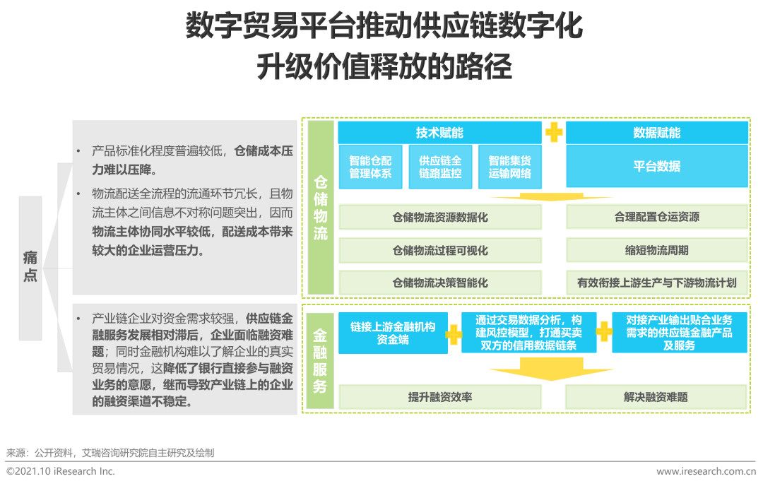 在供应链方面,产业主体普遍面临仓储成本高、物流配送协同水平低以及供应链金融服务发展滞后难以缓解买卖双方的资金压力等痛点,数字贸易平台将加快产品标准化建设以降低仓储成本、强化物流配送全流程的信息监控力以提高物流主体的协同能力以及深化大数据风控应用能力以提供有效的供应链金融产品。这利于充分挖掘整个产业供应链的数字化升级价值,并为中国经济的供给侧高水平转型升级提供“供应链数字力量”的强动力。