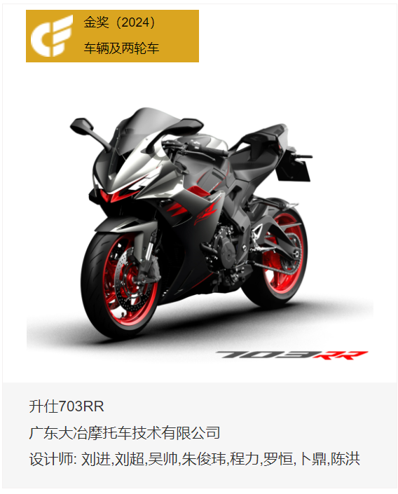 据介绍,广东大冶摩托车技术有限公司的升仕703RR摩托车获得2024年广交会设计创新奖(CF奖)金奖。江门外贸集团有限公司生产的家庭用品类产品不锈钢双桶垃圾桶和江门市盈佑贸易有限公司的家庭用品类产品双层分类垃圾桶,均获得了2024年广交会设计创新奖(CF奖)银奖;广东建雅摩托车科技有限公司生产的金刚狼800cc大型巡航摩托车获得了2024年广交会设计创新奖(CF奖)铜奖。
