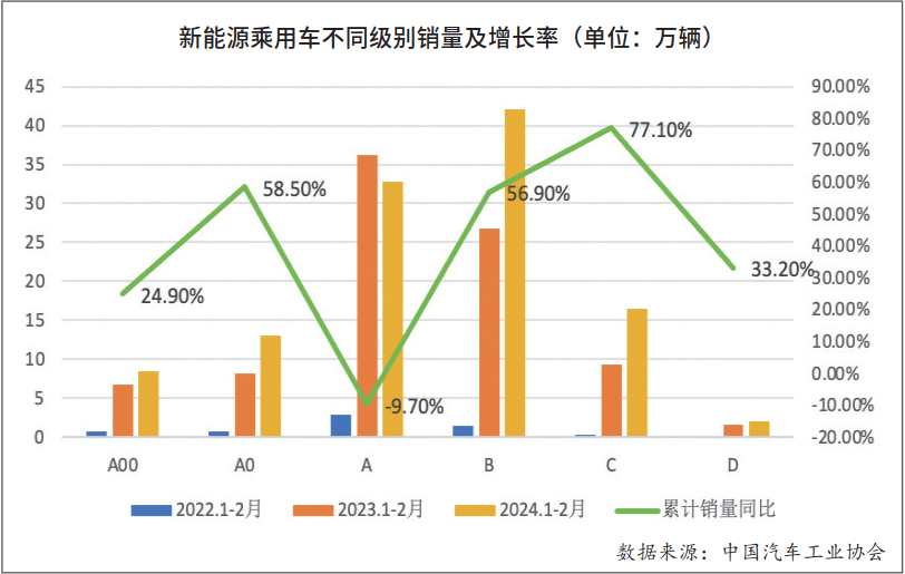 2024年伊始,国内汽车市场便迎来了新一轮的降价热潮。首先是特斯拉宣布对Model 3焕新版和Model Y四款车型进行降价,随后哪吒汽车、吉利帝豪、领克、上汽通用五菱、问界等多个品牌迅速跟进,价格战就此打响。2月18日,龙年开工第一天,吉利、小鹏、五菱等车企分别在发布的“开工信”中提到,“最卷”的一年、“血海”竞争的第一年、前所未有的复杂竞争局面……他们均认为2024年将是车市竞争更为激烈的一年。而在2月7日,中国汽车工业协会副秘书长柳燕在谈及龙年营销关键词时也表示,“对于一些车企而言,2024年的竞争已经不是定输赢,而是决生死。”随着时间发酵,价格战持续升温。2月19日,比亚迪率先吹响了向燃油车市场进攻的冲锋号——旗下秦PLUS荣耀版和驱逐舰05荣耀版两款A级车官方直降2万元,起售价低至7.68万元,并放出了“电比油低”的口号。一时间,群雄并起,多家车企在一天之内接连响应并发布降价海报,上汽通用五菱品牌事业部副总经理周钘更是在个人微博上表示:“一个字,跟!”,颇有大干一场的味道。与此同时,记者还注意到,这轮车市降价潮中,车企竞争手段颇为多样,或增配减价发布新车,或对现款车型直接降价,或给出现金折扣,或赠送高额优惠及权益。而降价车型则以“走量”的A级新能源汽车为主,售价主要集中在10-15万元区间,降价幅度在5%-15%之间,价格下降从几千到几万元不等。有观点认为,导致车企普遍降价是原材料价格下跌所致。截止2023年3月14日,工业级碳酸锂国内混合均价为107400元/吨,相比去年同期下降近7成,回落至2021年初水平。而在《汽车纵横》记者看来,这纵然是其中一个原因,但电池原材料的价格波动传导到新能源汽车的终端售价并不会这么快。究其根本,原因还是在于当前国内汽车消费仍处于相对低迷状态——受上个月的销量透支、春节长假等因素的影响——即便是降价促销的消息满天飞,依旧未能改变2月乘用车市场产销双双下滑的事实。据中国汽车工业协会(以下简称:“中汽协会”)数据显示,今年2月份,国产汽车产销分别完成150.6万辆和158.4万辆,环比分别下降37.5%和35.1%,同比分别下降25.9%和19.9%。其中,新能源汽车的产销量分别为46.4万辆和47.7万辆,环比分别下降41.1%和34.6%,同比分别下降了16%和9.2%。值得关注的是,在1-2月新能源乘用车中,除A级车的销量出现了下滑外,其他级别车型均出现了不同程度的正增长。而作为对比,2023年新能源乘用车市场销量主要集中在A级,且全年累计销量达到了347.1万辆。