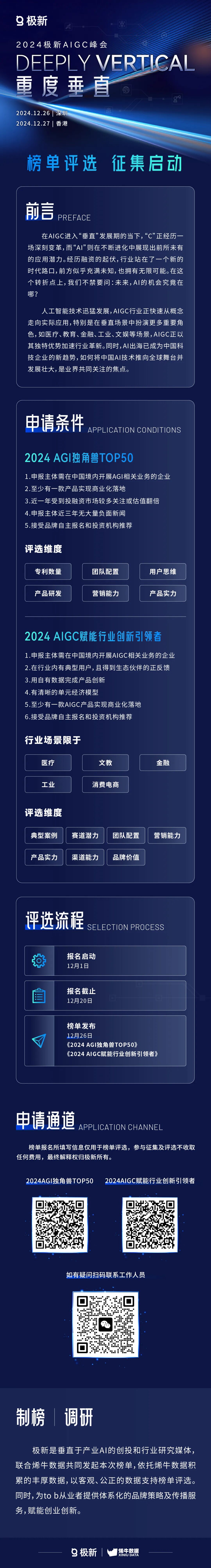 因此,极新联合烯牛数据共同推出「2024AGI独角兽TOP50」和「2024AIGC赋能行业创新引领者」,旨在识别和表彰那些在AGI和AIGC领域取得显著成就的企业,这些企业不仅推动了技术的创新,也为各行各业带来了变革性的影响。通过这两个榜单,我们希望能够激励更多的人工智能企业投身于创新浪潮,也是对那些在幕后默默耕耘、为技术进步做出贡献的科研人员和工程师的致敬。