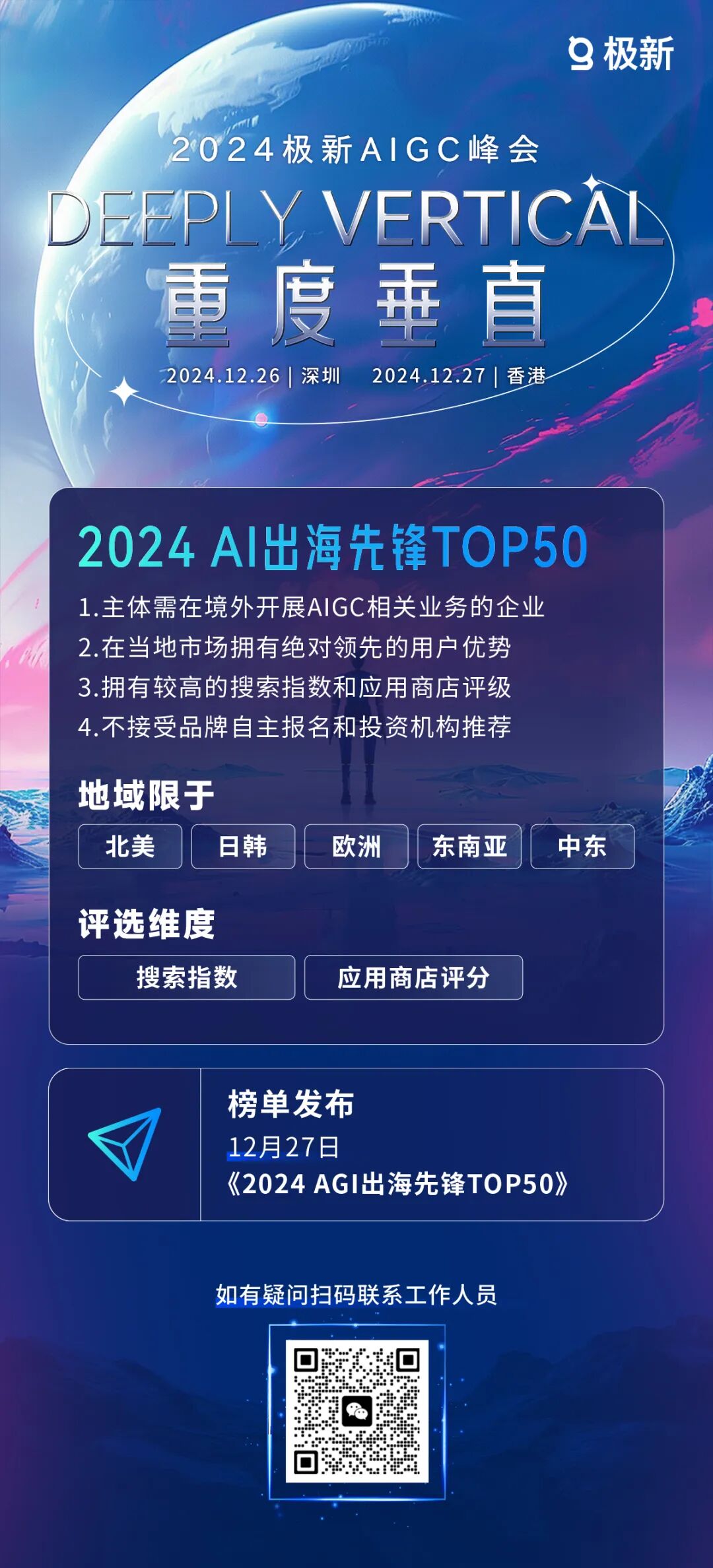 同时,极新还推出「2024 AI出海先锋TOP50」榜单,参考谷歌、亚马逊云科技的公开数据,旨在表彰那些在全球市场上取得显著成就的中国AI企业,通过这个榜单,我们希望能够激励更多的中国AI企业走向世界,参与全球竞争,同时也为国际市场提供更多高质量的AI产品和服务。