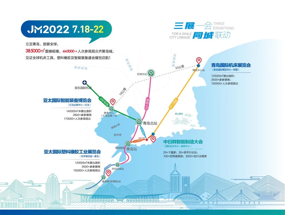 为迎合制造业产业发展需求,金诺会展抢抓机遇,2022年在青岛同时入驻三大会展中心,将于7月18-22日,在青鸟国际博览中心(即墨)、红岛会展中心(红岛)、世界博览城(黄岛)同期召开第25届青岛国际机床展览会、第19届亚太国际智能装备博览会、APIE2022亚太国际塑料橡胶工业展览会、CJK2022中日韩智能制造大会。