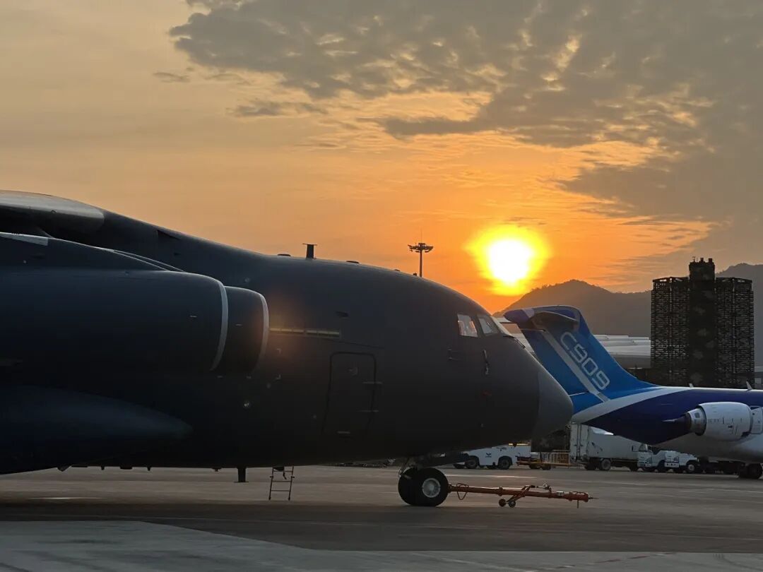 12号航展开幕式当天,小翼科普团队就已经在太阳刚升起时就已到达航展的现场,看着我们清晨的第一缕阳光照在我们的运-20上。