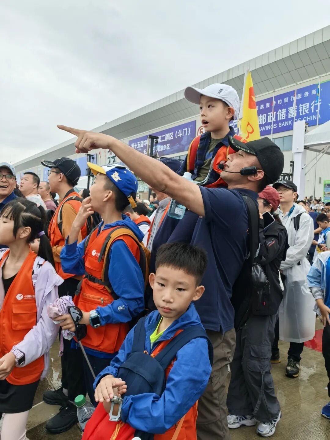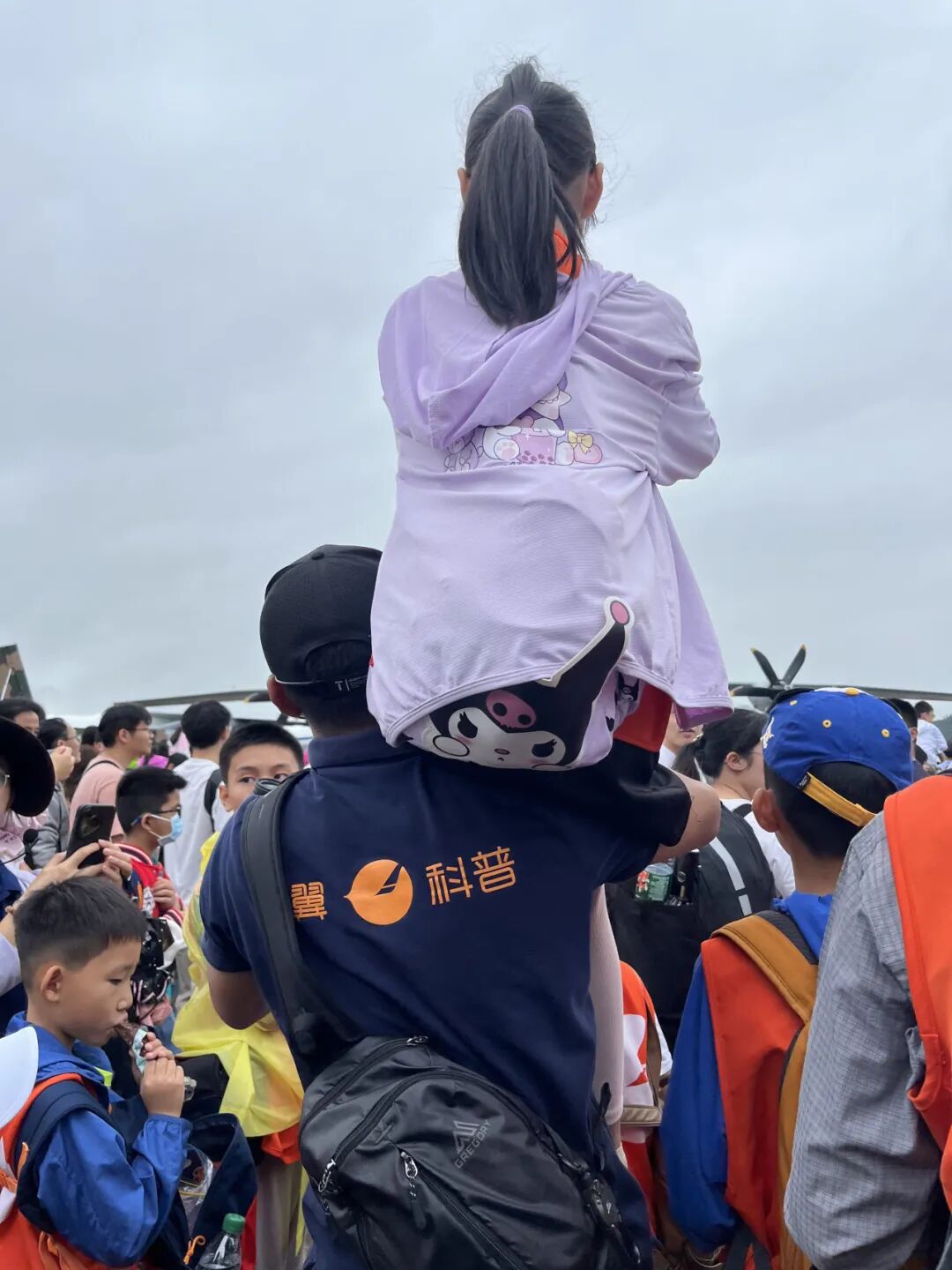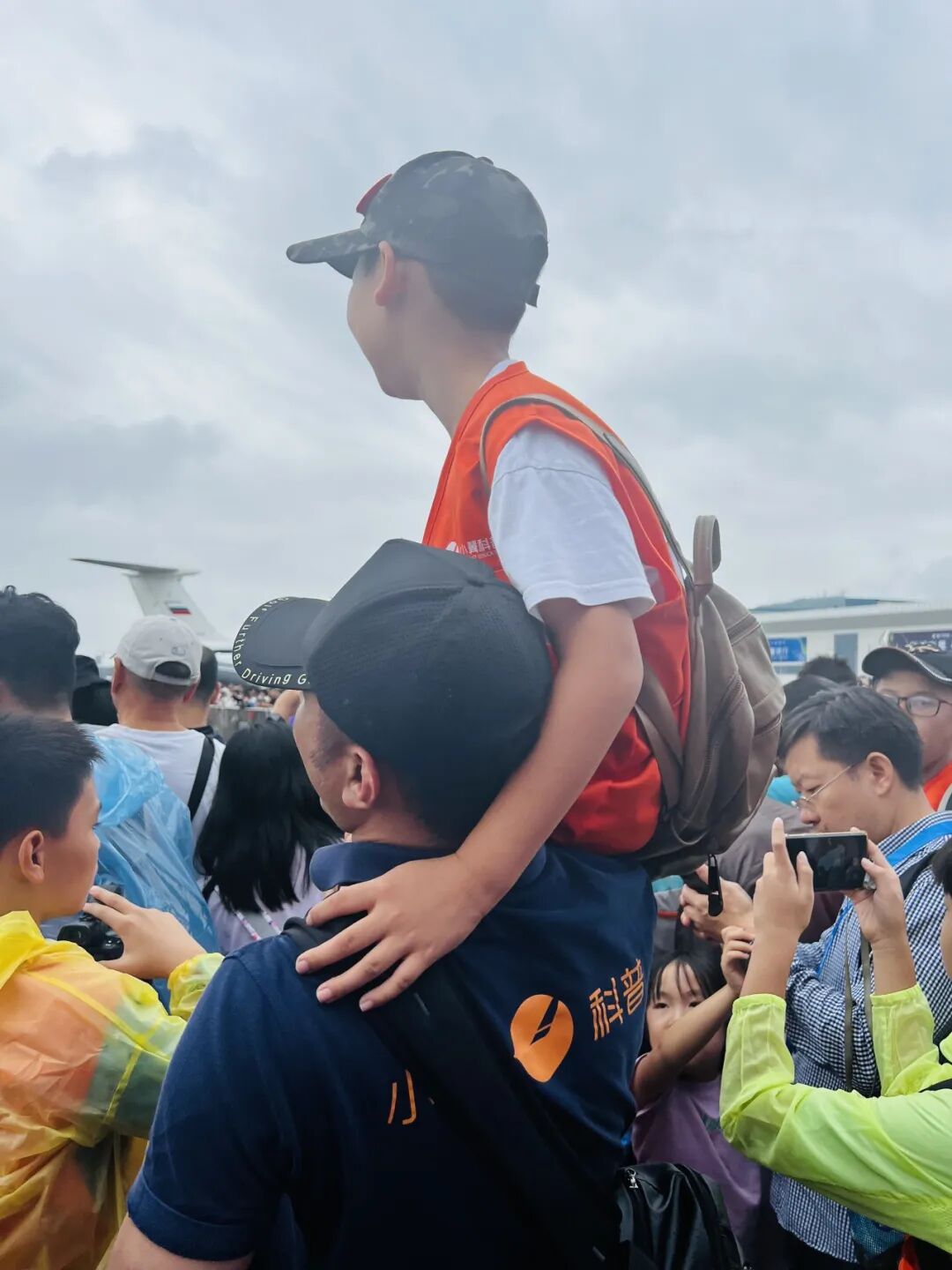 航展最后一天,现场人山人海。为了让我们的小朋友也能近距离观看地面静态展示的飞机,小翼科普的老师们毫不犹豫地将他们扛在肩上。
