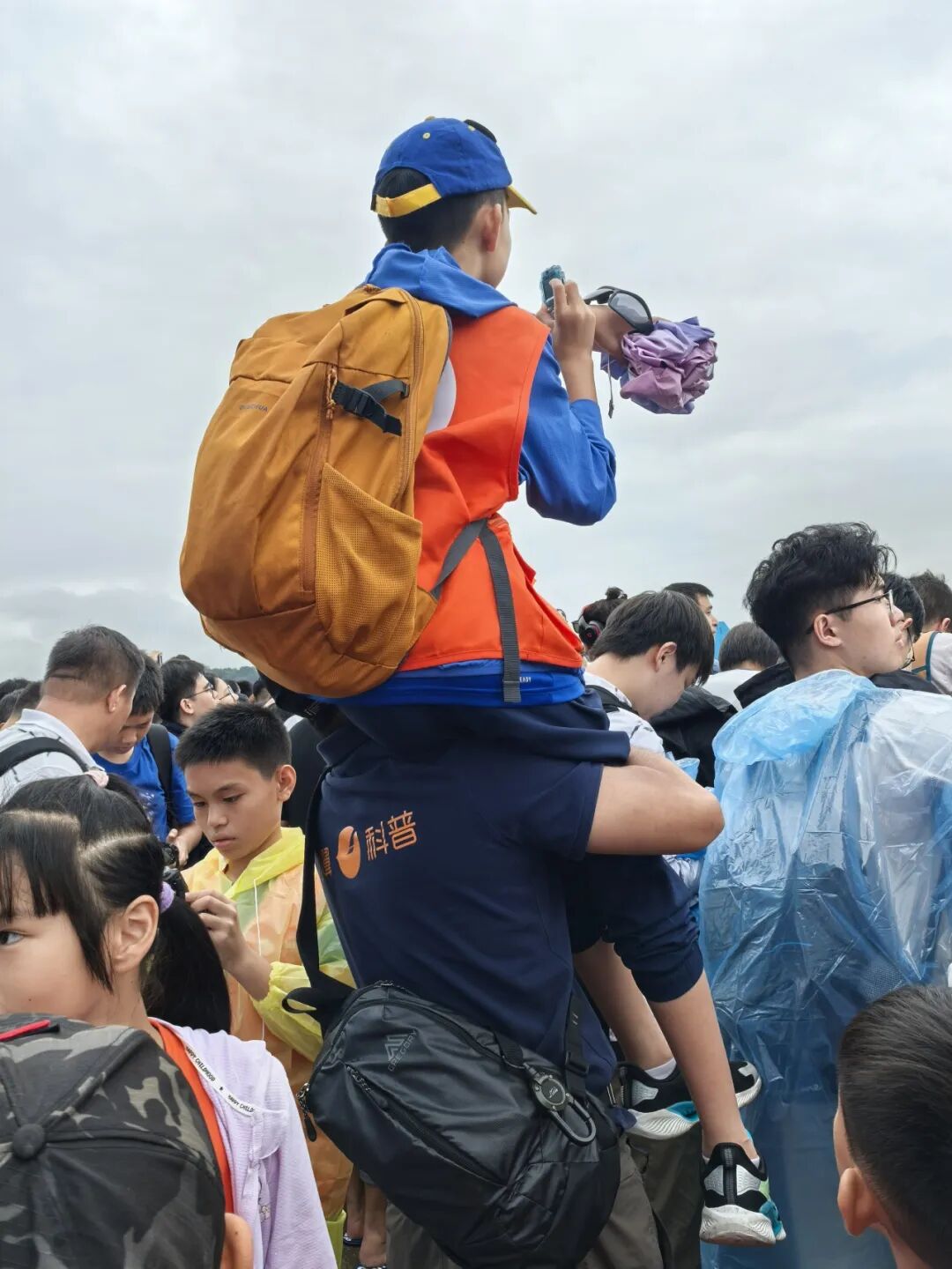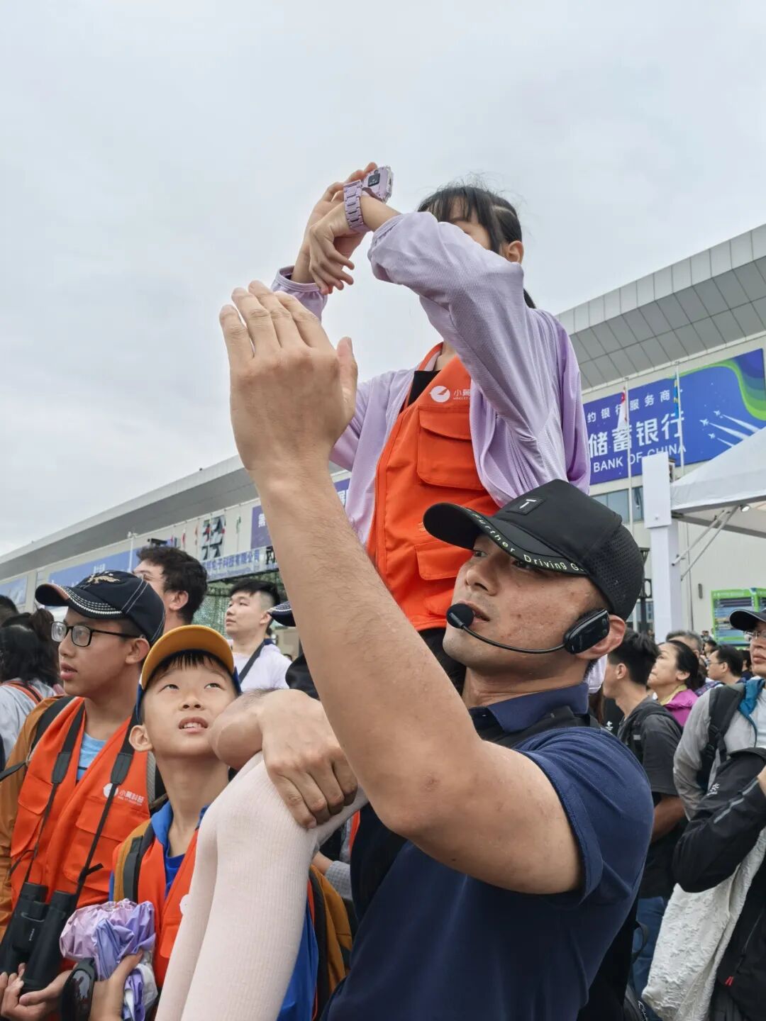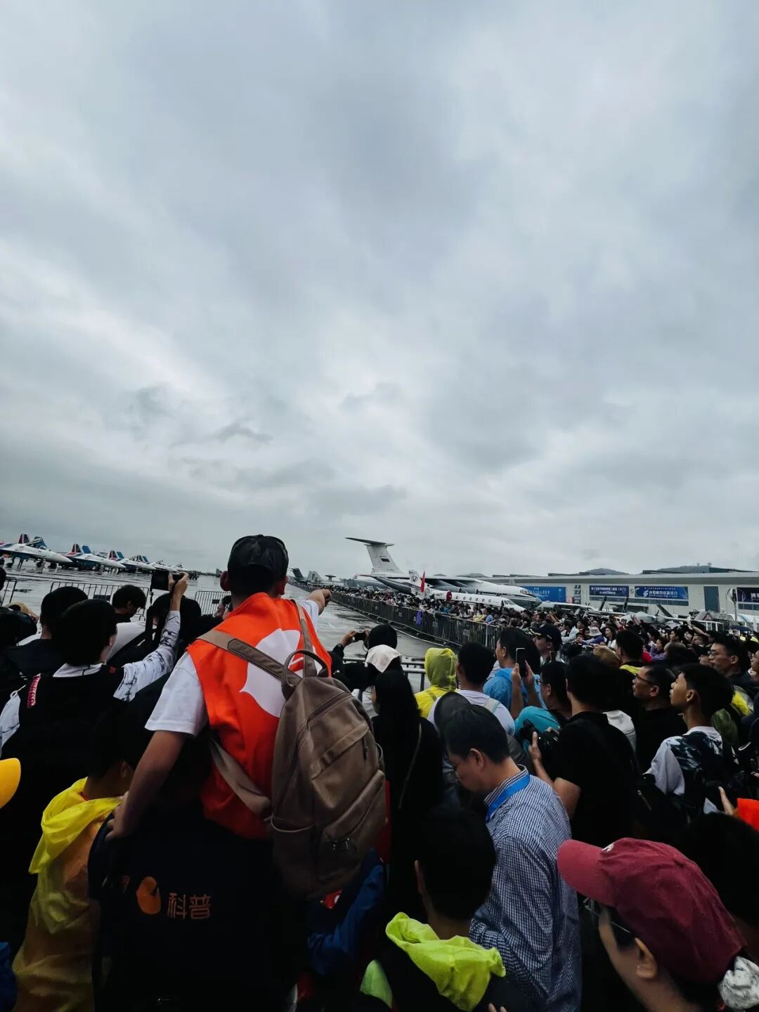 航展最后一天,现场人山人海。为了让我们的小朋友也能近距离观看地面静态展示的飞机,小翼科普的老师们毫不犹豫地将他们扛在肩上。