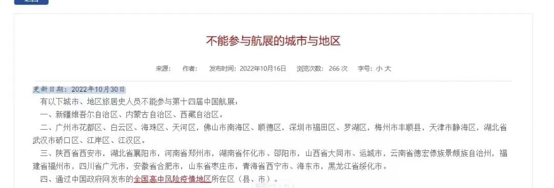 还有网上流传的一个30日发布的疫情地区不能参加航展的清单。大家一定要注意关注疫情变化,多做核酸。