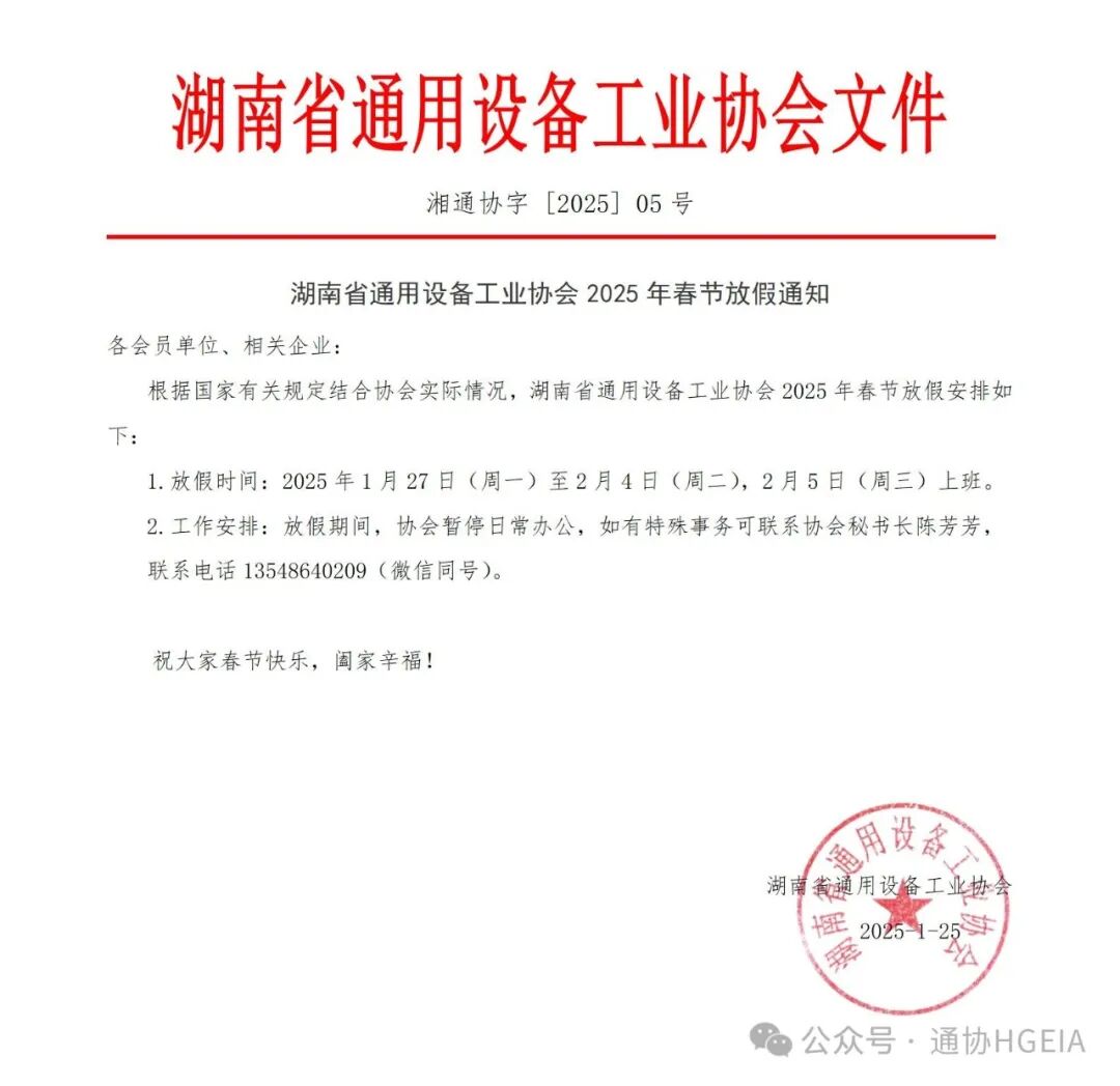 【放假通知】湖南省通用设备工业协会2025年春节放假通知
