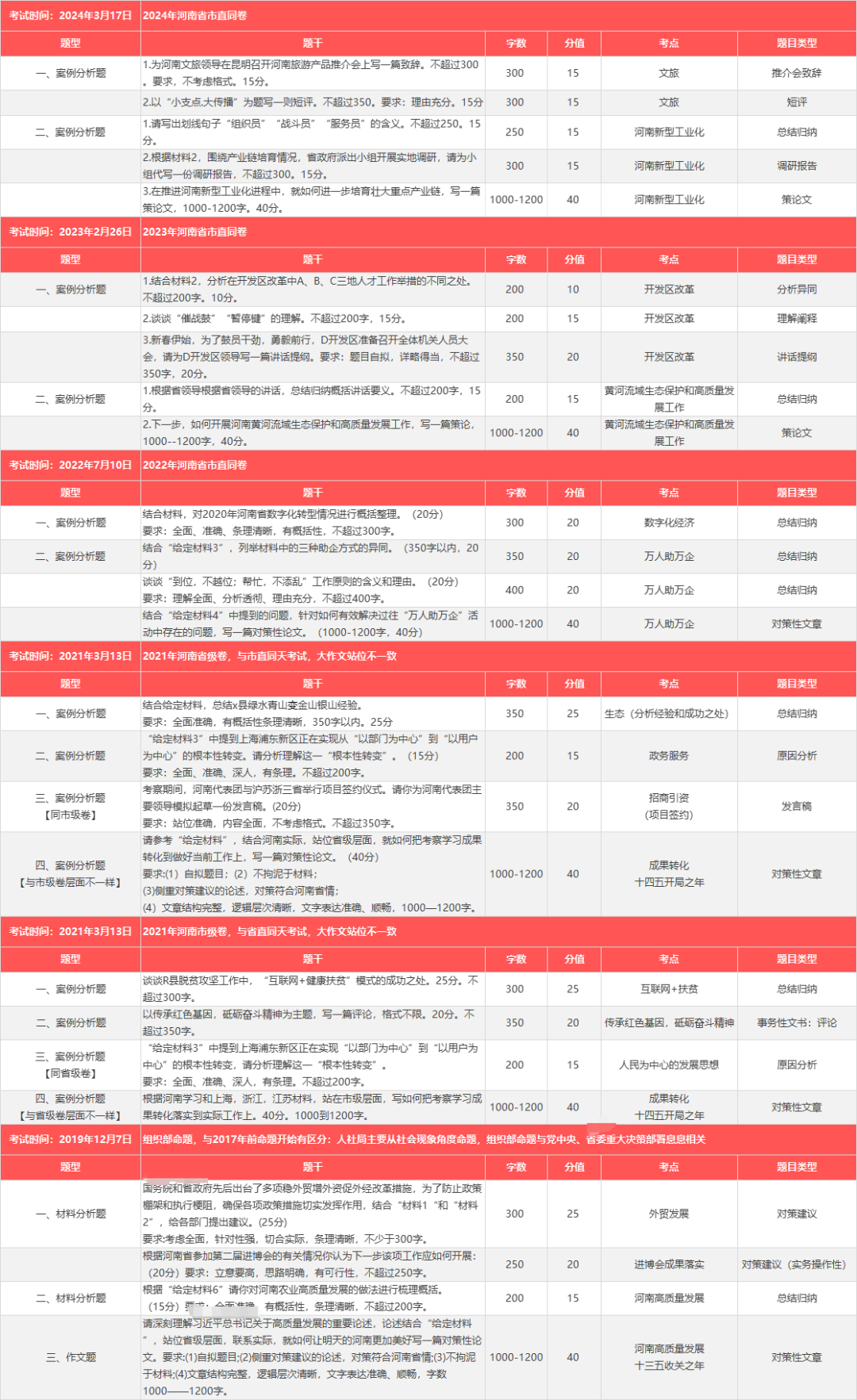 河南省市直遴选通常是四至五道题,作答字数在2000字左右。考试题型主要是案例分析、公文写作和策论文写作:案例分析主要题型是总结归纳、分析原因、阐释理解等,其中总结归纳题型每年常考;