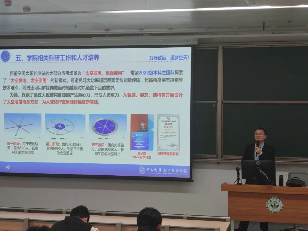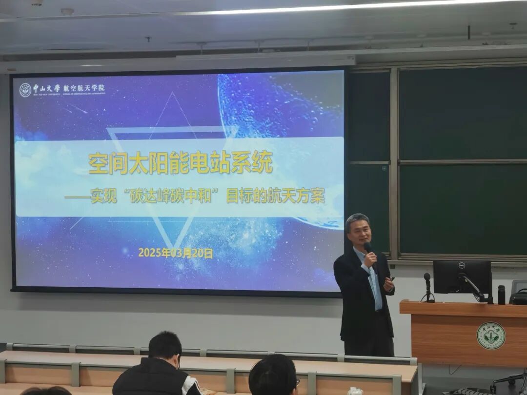 2025年3月20日,航空航天学院院长吴志刚教授以“实现碳达峰碳中和目标的航天方案——空间太阳能电站系统”为主题,在深圳校区西教学楼为2022级本科生讲授了一堂精彩生动的思政第一课。本次活动由本科生辅导员钟轩老师主持,研究生兼职辅导员、2022级全体本科生共同聆听了授课。
