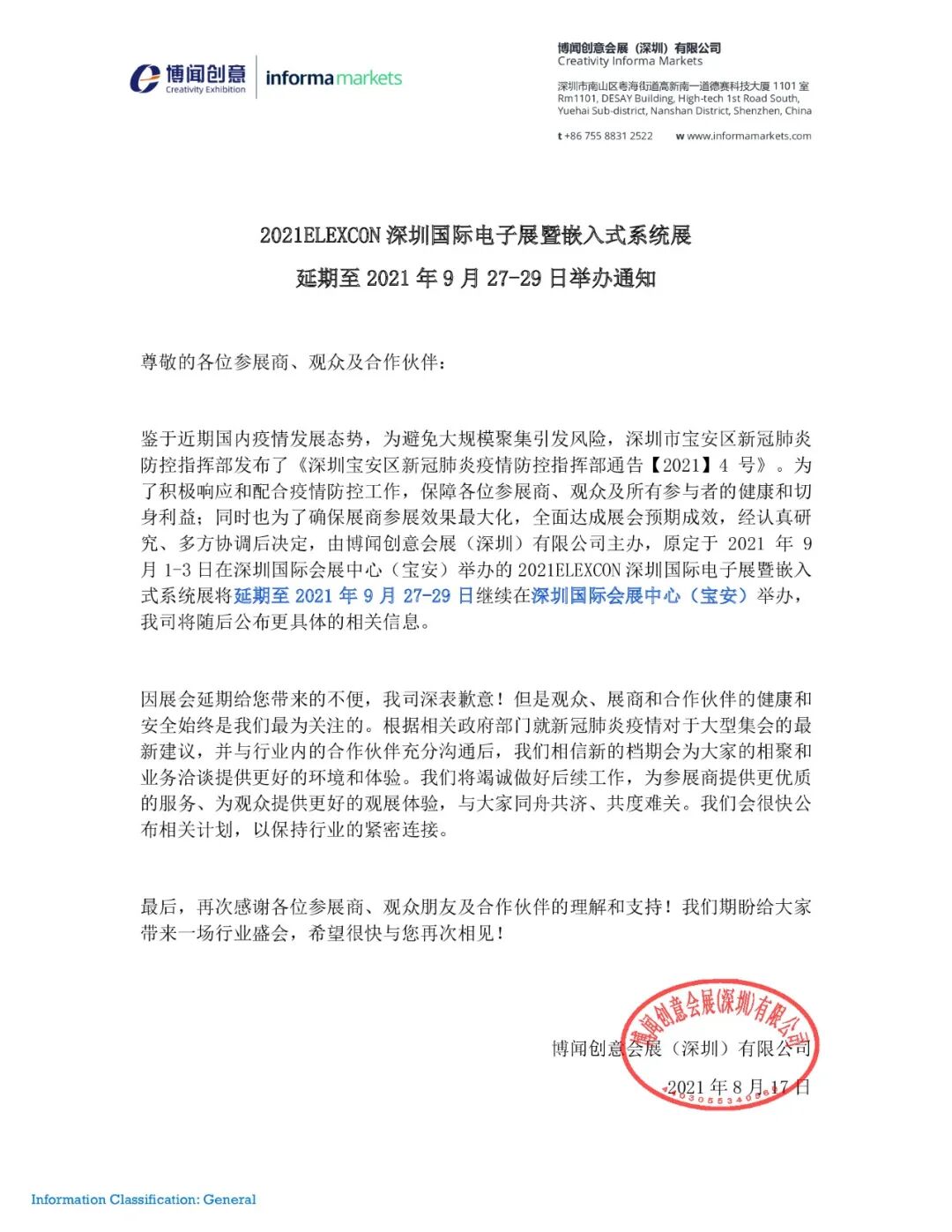 鉴于近期国内疫情发展态势,为避免大规模聚集引发风险,深圳市宝安区新冠肺炎防控指挥部发布了《深圳宝安区新冠肺炎疫情防控指挥部通告【2021】4号》。为了积极响应和配合疫情防控工作,保障各位参展商、观众及所有参与者的健康和切身利益;同时也为了确保展商参展效果最大化,全面达成展会预期成效,经认真研究、多方协调后决定,由博闻创意会展(深圳)有限公司主办,原定于2021年9月1-3日在深圳国际会展中心(宝安)举办的2021ELEXCON深圳国际电子展暨嵌入式系统展将延期至2021年9月27-29日继续在深圳国际会展中心(宝安)举办,我司将随后公布更具体的相关信息。