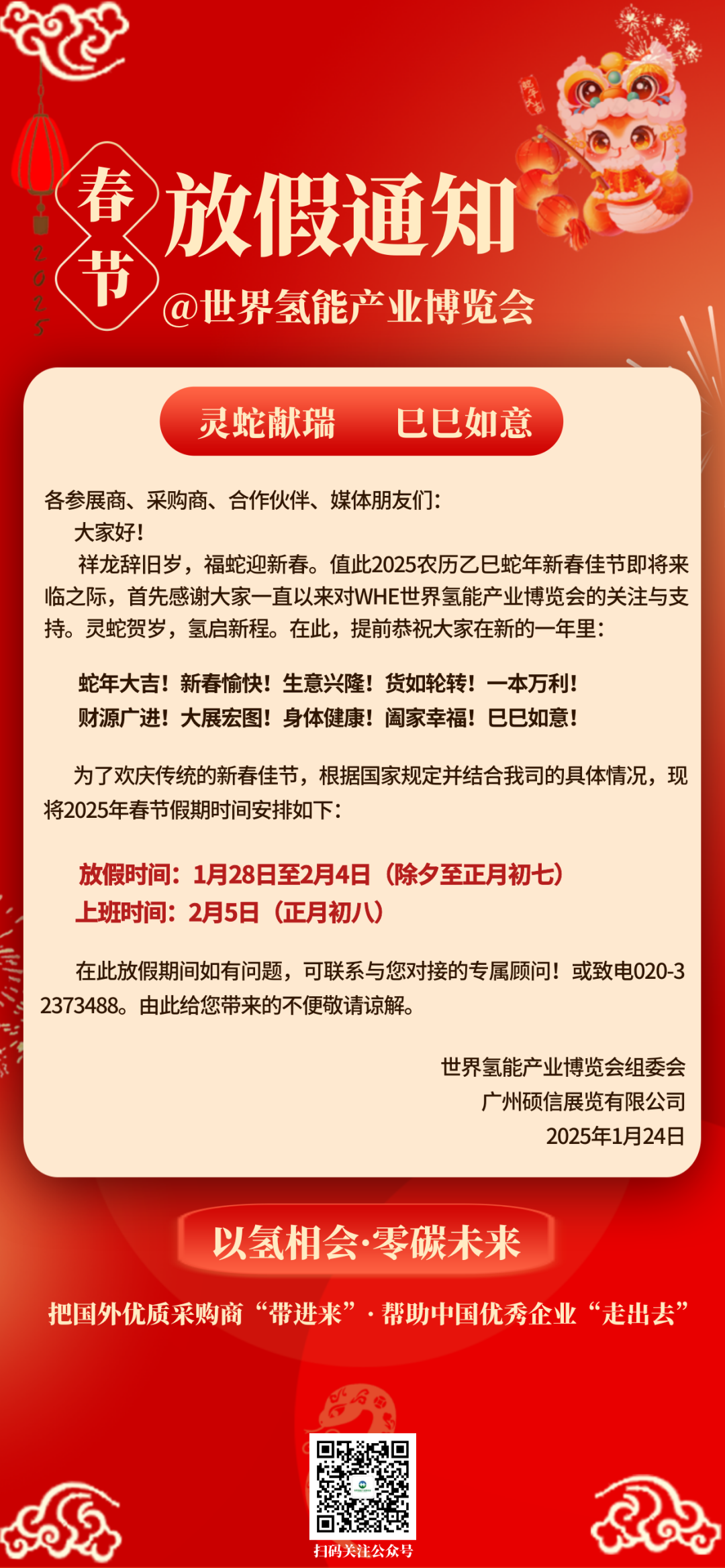 祥龙辞旧岁,福蛇迎新春。值此2025农历乙巳蛇年新春佳节即将来临之际,首先感谢大家一直以来对WHE世界氢能博览会的关注与支持。灵蛇贺岁,氢启新程。在此,提前恭祝大家在新的一年里:蛇年大吉!新春愉快!生意兴隆!货如轮转!一本万利!财源广进!大展宏图!身体健康!阖家幸福!巳巳如意!