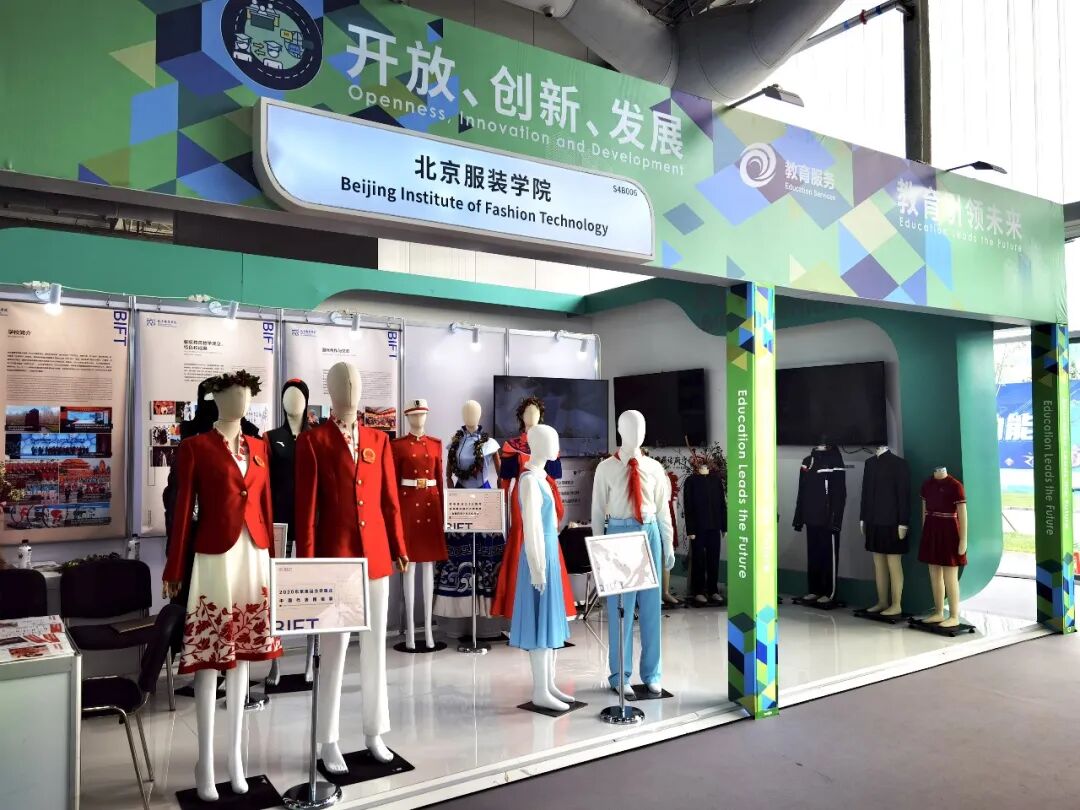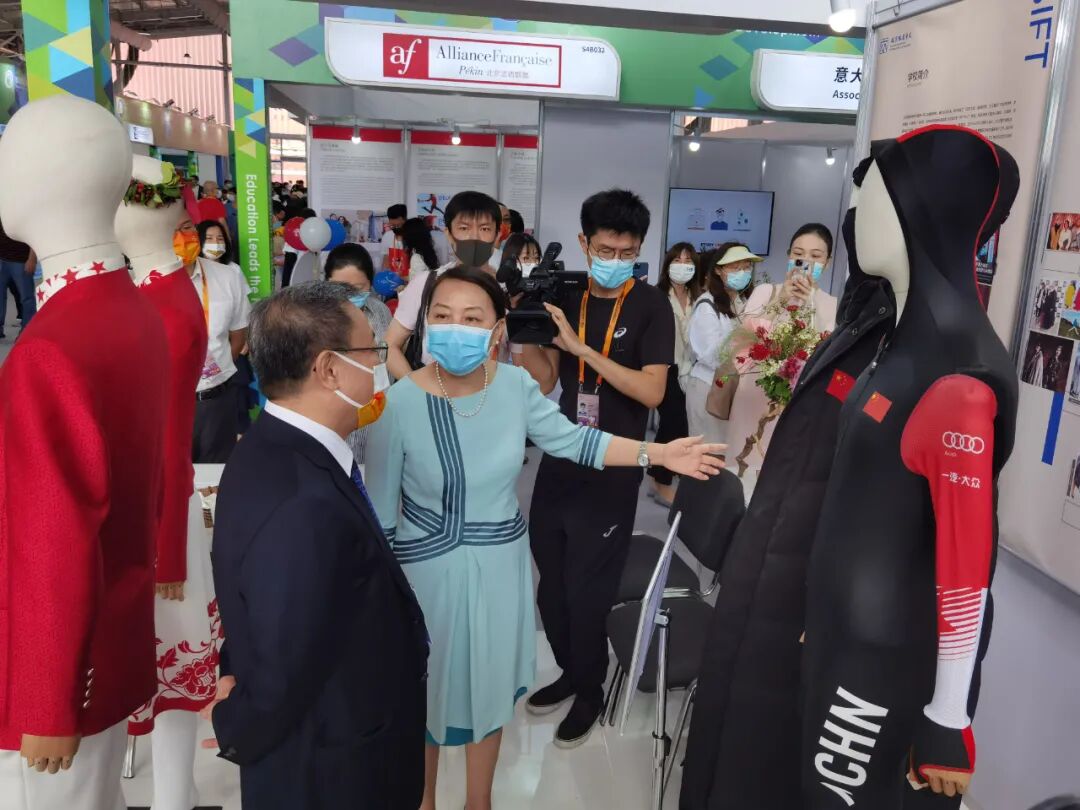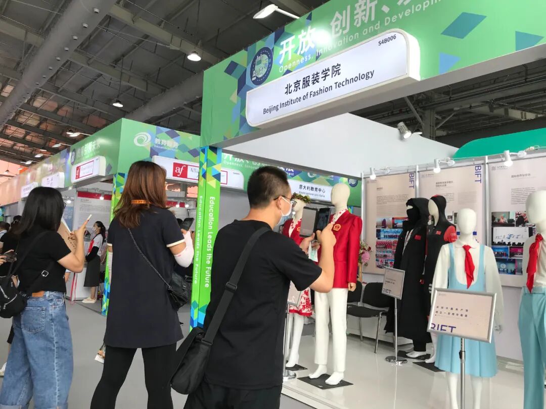 现场滚屏播放的学校宣传片、北服参与组织重大活动的视频资料、设计访谈以及北服时装周、国际青年设计师邀请展和国际首饰设计高校联盟活动等多个视频短片,展位中央陈列的包括2020东京奥运会开幕式中国代表团服装、新中国成立70周年民兵和群众游行方阵服装、庆祝中国共产党成立100周年大会献词团服装、2022年北京冬奥会高性能比赛服以及系列中小学校服设计实物,深深吸引了参展观众的目光,大家纷纷品评、拍照和留念,北服展位受到普遍关注和一致好评。