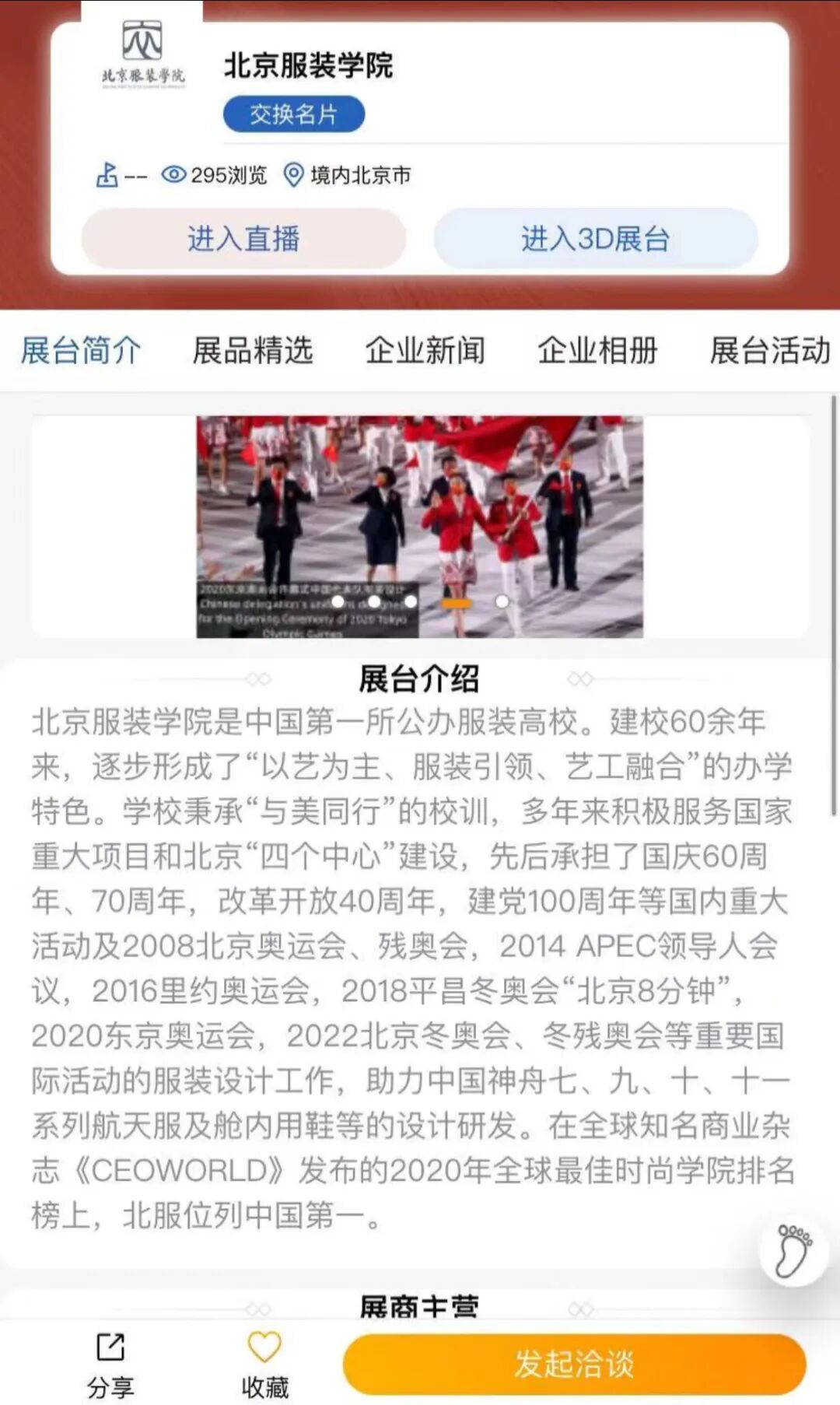 除线下展位外,我校同时开设有服贸会线上展厅,精选视频和图文,分5个主题板块,进行为期1年的线上展示宣传。展厅主要从学校优势和特色,教学理念和成果,国际合作与交流成效,落脚到国际教育,全方位展示北京服装学院的教育国际化成果以及教育对外开放的能力。