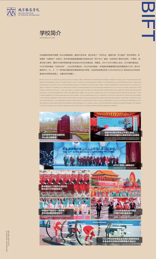 本次北服线下展位(4号教育展厅006号展位)聚焦于北服办学定位和社会使命,服装教育教学理念、特色和成果以及国际合作与交流三个板块,通过24个主题图文、8个专题视频和5个系列15套服装实物,多维度凸显我校在新中国成立60周年、70周年、建党百年及2008年奥运会、2020东京奥运会和2022年冬奥会、冬残奥会等重要国内国际活动中承担的服装设计任务,从一个侧面展示我校“以艺为主、服装引领、艺工融合”的办学特色和教育教学成果,彰显北服活跃开放的国际化办学水平和国际影响力。