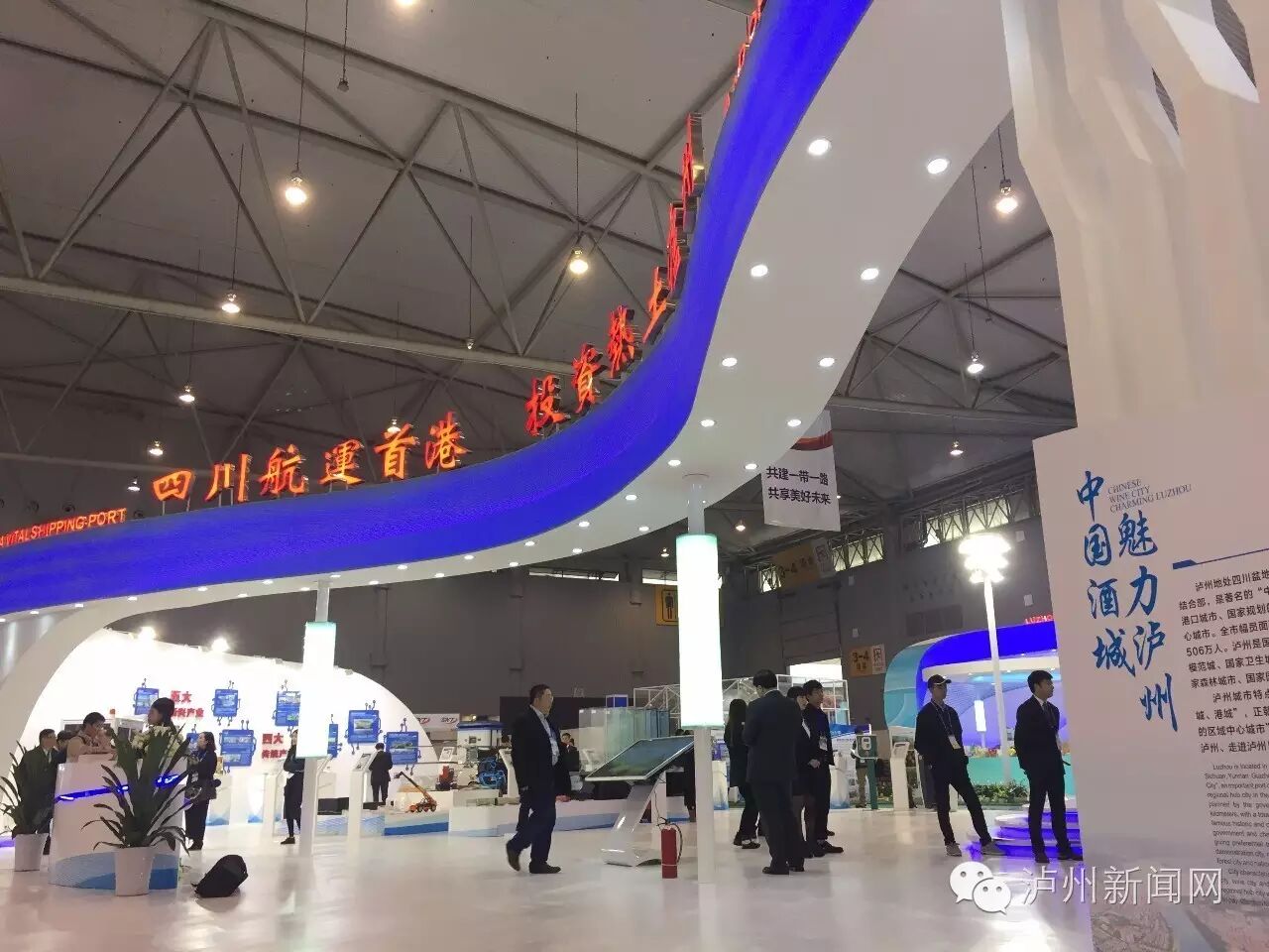 据了解,泸州特装馆面积共1243平米,主题为“四川航运首港、投资热土泸州”。墙体整体造型由沱江、长江两江汇合的创意设计而成,外立面则由13张城市名片组成的名片墙、泸州城市剪影墙及投资泸州企业的LOGO墙组建而成。展馆共分为现代工业篇、现代农业篇、城市篇、三区四县篇四大版块。