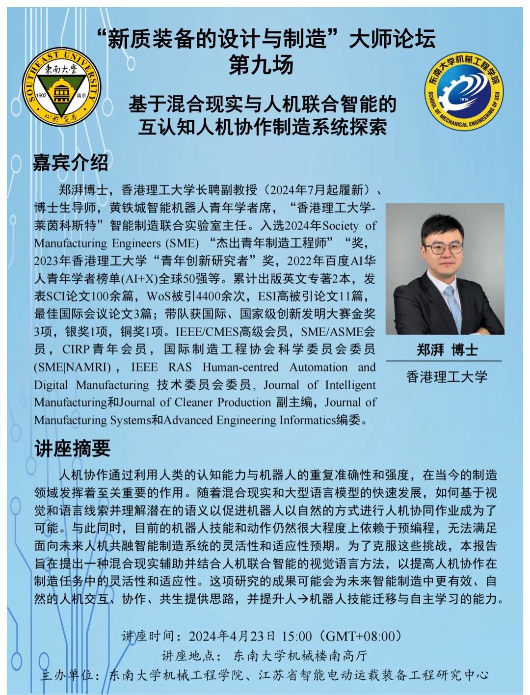 郑湃博士,香港理工大学长聘副教授(2024年7月起履新)、博士生导师,黄铁城智能机器人青年学者席,“香港理工大学-莱茵科斯特”智能制造联合实验室主任。入选2024年Society of Manufacturing Engineers (SME) “杰出青年制造工程师”“奖,2023年香港理工大学“青年创新研究者”奖,2022年百度AI华人青年学者榜单(AI+X)全球50强等。累计出版英文专著2本,发表SCI论文100余篇,WoS被引4400余次,ESI高被引论文11篇,最佳国际会议论文3篇;带队获国际、国家级创新发明大赛金奖3项,银奖1项,铜奖1项。IEEE/CMES高级会员,SME/ASME会员,CIRP青年会员,国际制造工程协会科学委员会委员(SME|NAMRI),IEEE RAS Human-centred Automation and Digital Manufacturing 技术委员会委员, Journal of Intelligent Manufacturing和Journal of Cleaner Production 副主编,Journal of Manufacturing Systems和Advanced Engineering Informatics编委。