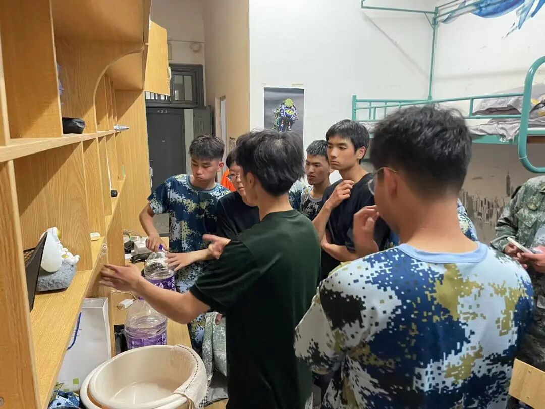 在训练结束之后各连教官与辅导员下寝视察新生情况,并对寝室卫生条例作出了指导,经过教官与辅导员的指导后,各位同学都能将卫生工作尽职的完成,光洁的地板,整洁的书桌,方方面面都是严格按照军训的条例。