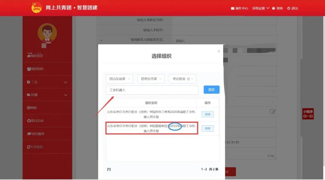 在选择组织界面中依次选择团山东省委、团枣庄市委、枣庄职业(技师)学院团委。在搜索栏里输入自己的班级进行选择转入。