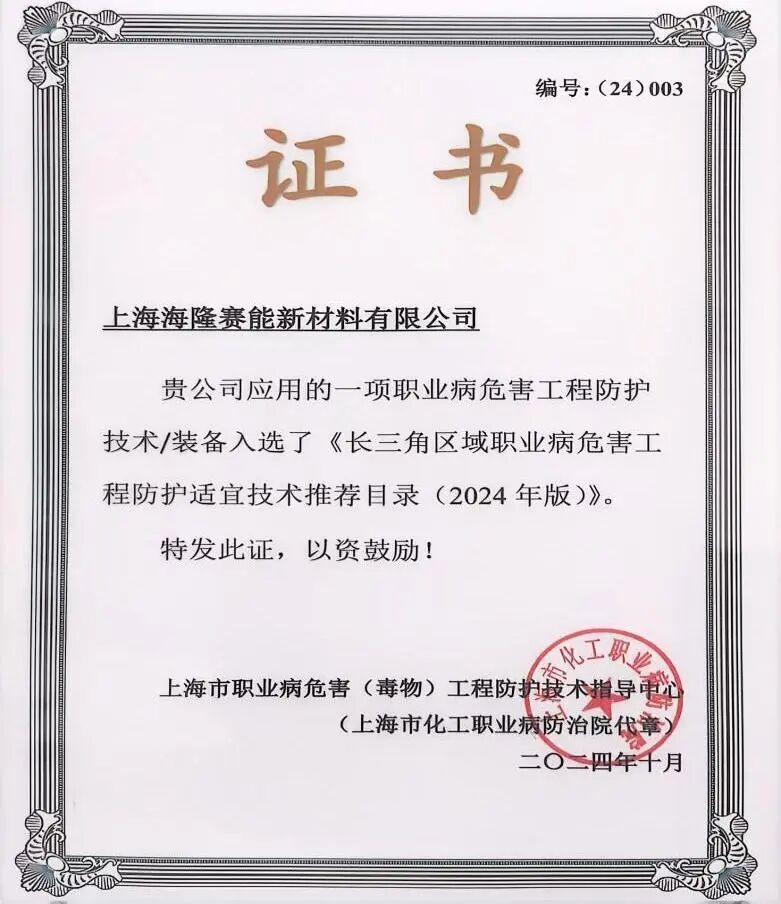 作为涂料生产企业,职业病防护也是海隆赛能重点工作,我司“局部逸散点隔离技术措施”职业病危害防护技术24年度得到市职业病防治院认可,并入选《长三角区域职业病危害防护适宜技术推荐目录(2024年版)》。