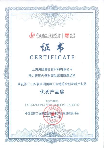 热力管道内防腐减阻涂料荣获第二十四届中国国际工业博览会新材料产业展优秀产品奖。该产品先后历经10年开发和应用,耐高温高压热水性能优异,对国内外供热行业的节能减排和安全运行具有显著的经济价值和社会效益。