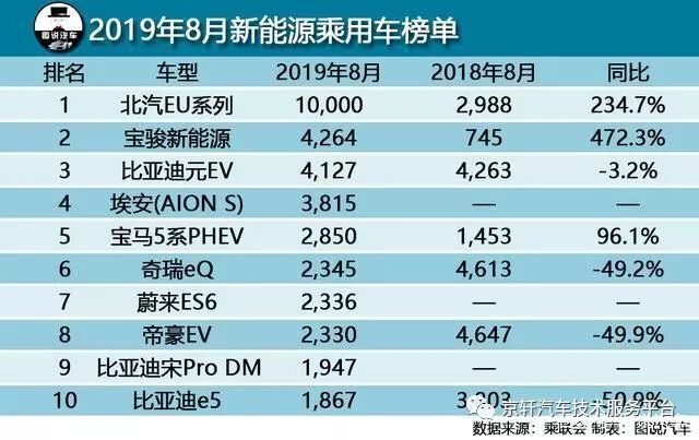 从具体车型销量来看,就能明显感受到这21.7%的同比跌幅,在榜10款车型,有4款都出现了销量下滑,其中三款跌幅近半,销量近乎腰斩,和去年同期对比非常明显。在该细分领域中,北汽EU系列斩获8月销量冠军宝座,也是榜单中为数不多依旧保持3位数增幅的产品。