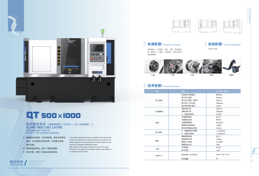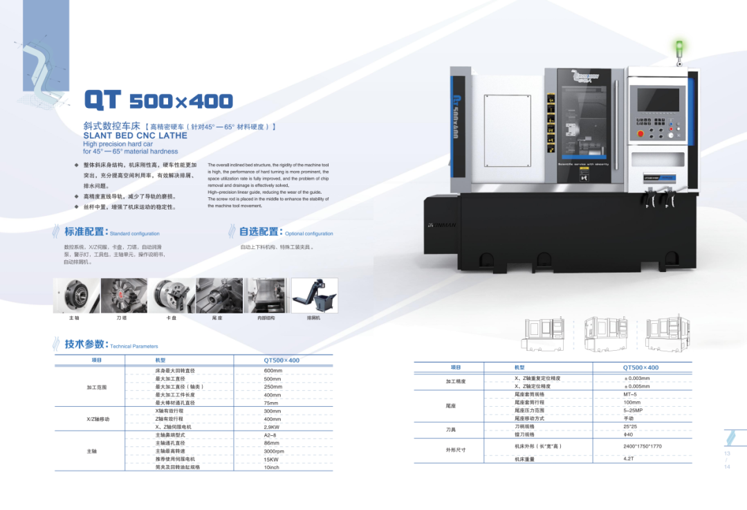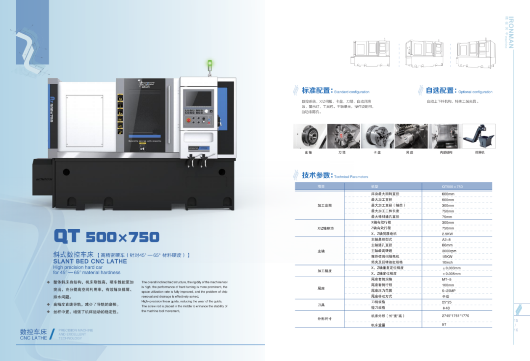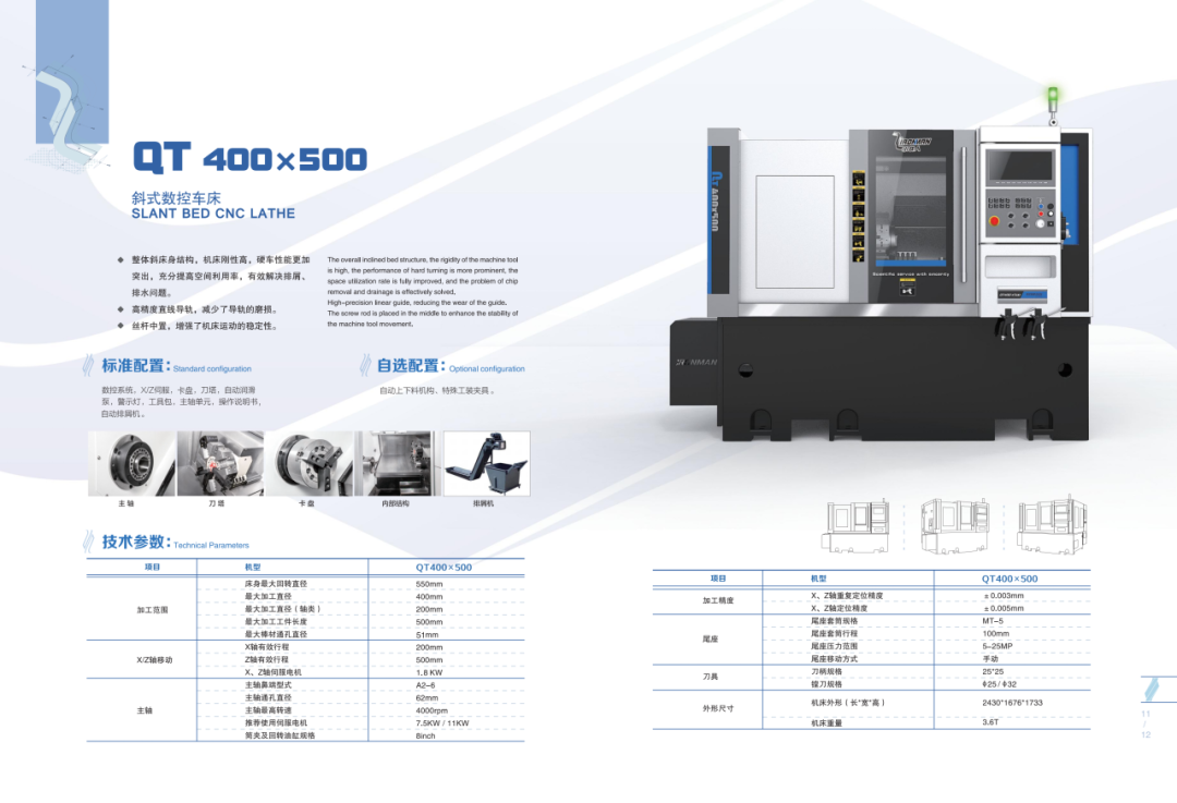 公司经过多年的发展,积累了丰富的制造经验和一整套先进生产管理体系。近年来不断加大投入,引进具有高端技术含量的龙门加工中心,卧式加工中心等多台套国内外一流生产设备,从而提高了产品品质。本公司生产的“小铁人”牌数控机床产品有:QT320L 斜式数控机床、QT400x400 斜式数控机床、QT400x500 斜式数控机床、QT500x400 斜式数控机床、QT500x750 斜式数控机床、QT36 数控机床、QT46 数控机床、QT52 数控机床、CJK0636 数控机床、CJK0636L 数控机床、CJK0640 数控机床。以高效、快捷简便的工作原理,深受广大用户的信赖和好评,在国内外市场上也获得了良好的口碑和赞誉。
