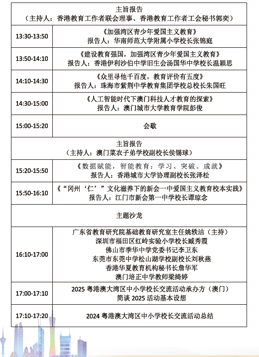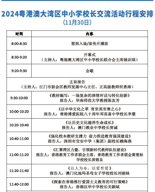 为全面落实教育强国建设战略任务,深入贯彻《粤港澳大湾区规划纲要》,搭建粤港澳中小学校长交流平台,积极履行新时代赋予粤港澳大湾区中小学校长的使命与责任,决定举办2024粤港澳大湾区中小学校长交流活动。
