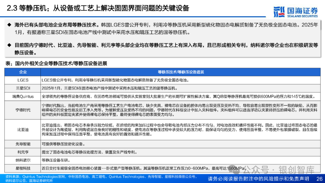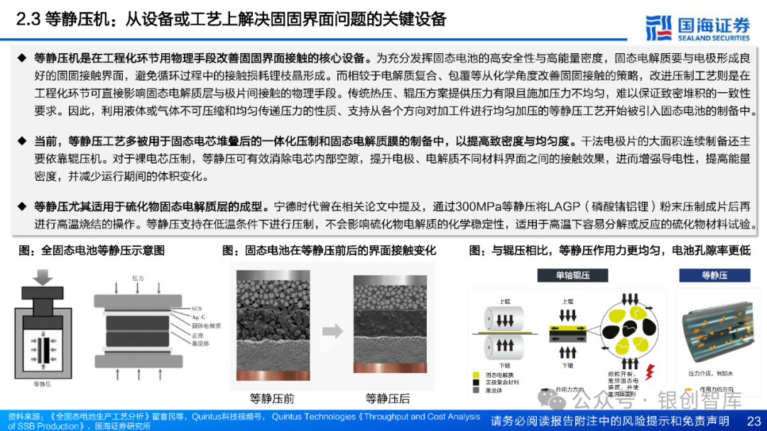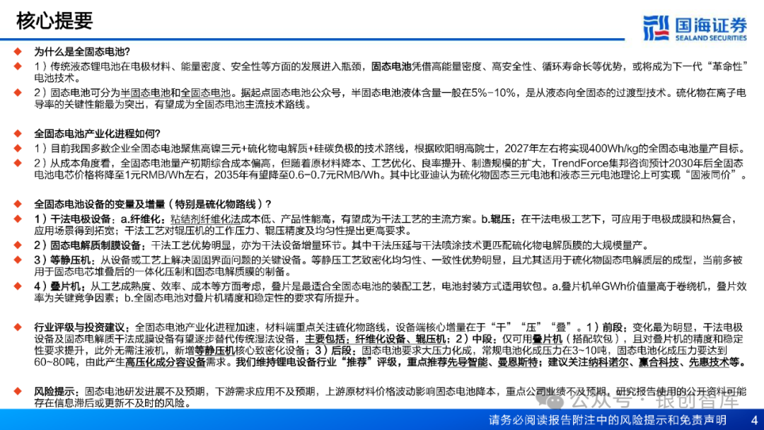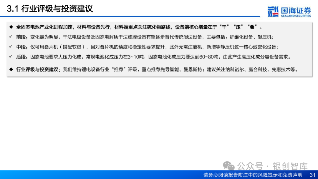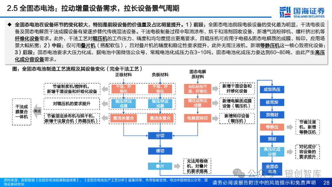1)干法电极设备:a.纤维化:粘结剂纤维化法成本低、产品性能高,有望成为干法工艺的主流方案。b.辊压:在干法电极工艺下,可应用于电极成膜和热复合,应用场景得到拓宽;干法工艺对辊压机的工作压力、辊压精度及均匀性提出更高要求。 2)固态电解质制膜设备:干法工艺优势明显,亦为干法设备增量环节。其中干法压延与干法喷涂技术更匹配硫化物电解质膜的大规模量产。 3)等静压机:从设备或工艺上解决固固界面问题的关键设备。等静压工艺致密化均匀性、一致性优势明显,且尤其适用于硫化物固态电解质层的成型,当前多被用于固态电芯堆叠后的一体化压制和固态电解质膜的制备。 4)叠片机:从工艺成熟度、效率、成本等方面考虑,叠片是最适合全固态电池的装配工艺,电池封装方式适用软包。a.叠片机单GWh价值量高于卷绕机,叠片效率为关键竞争因素;b.全固态电池对叠片机精度和稳定性的要求有所提升。