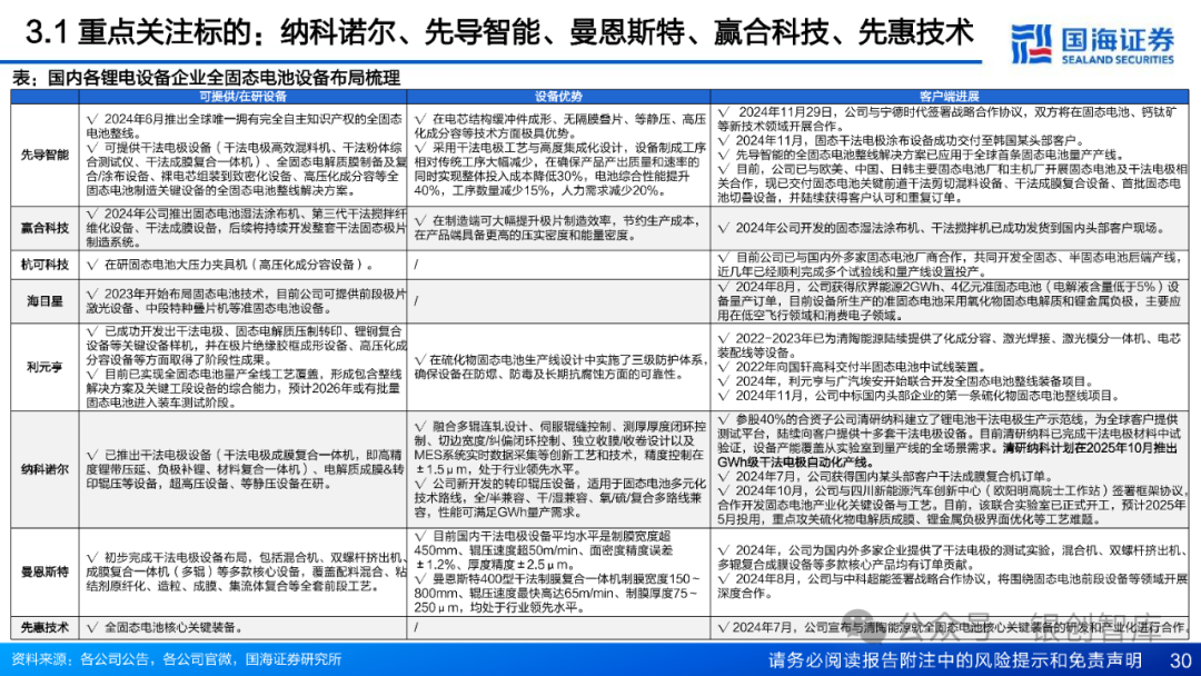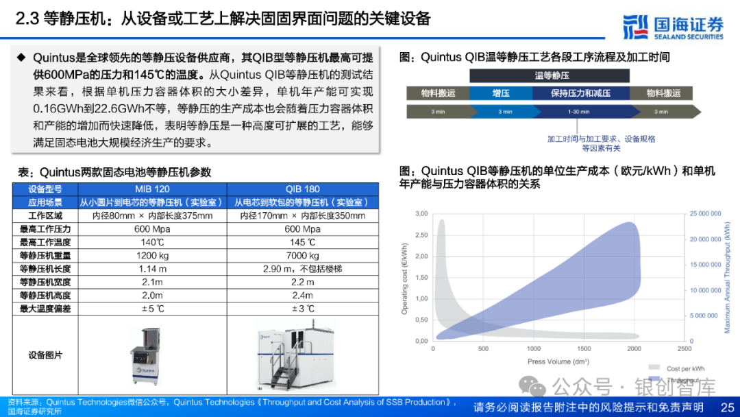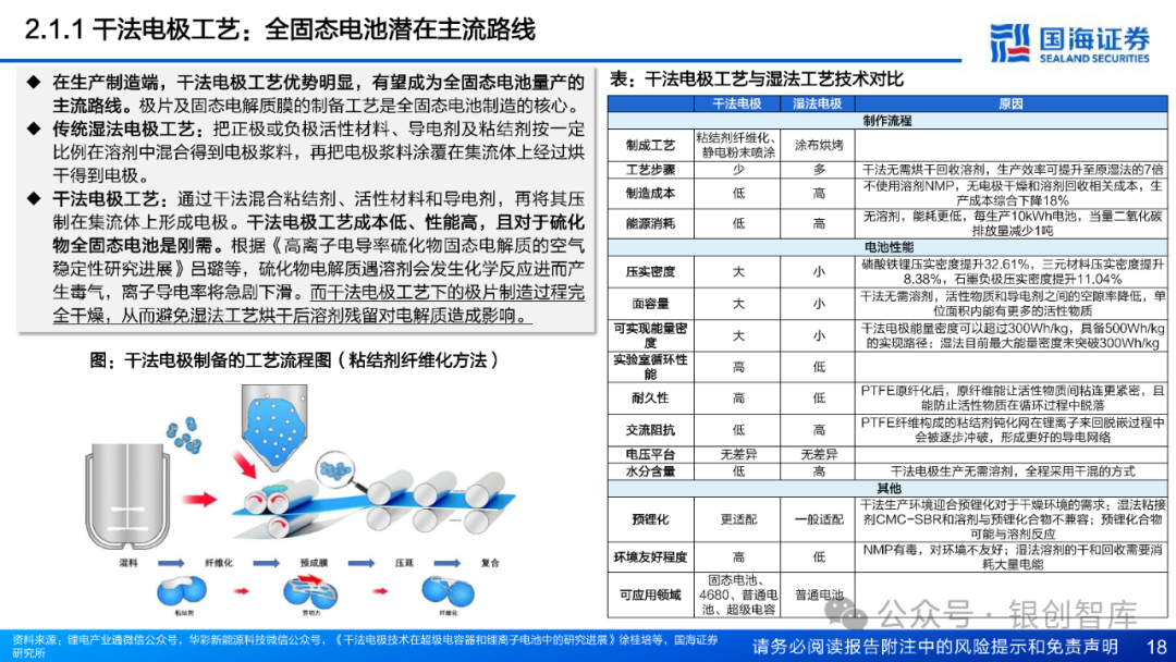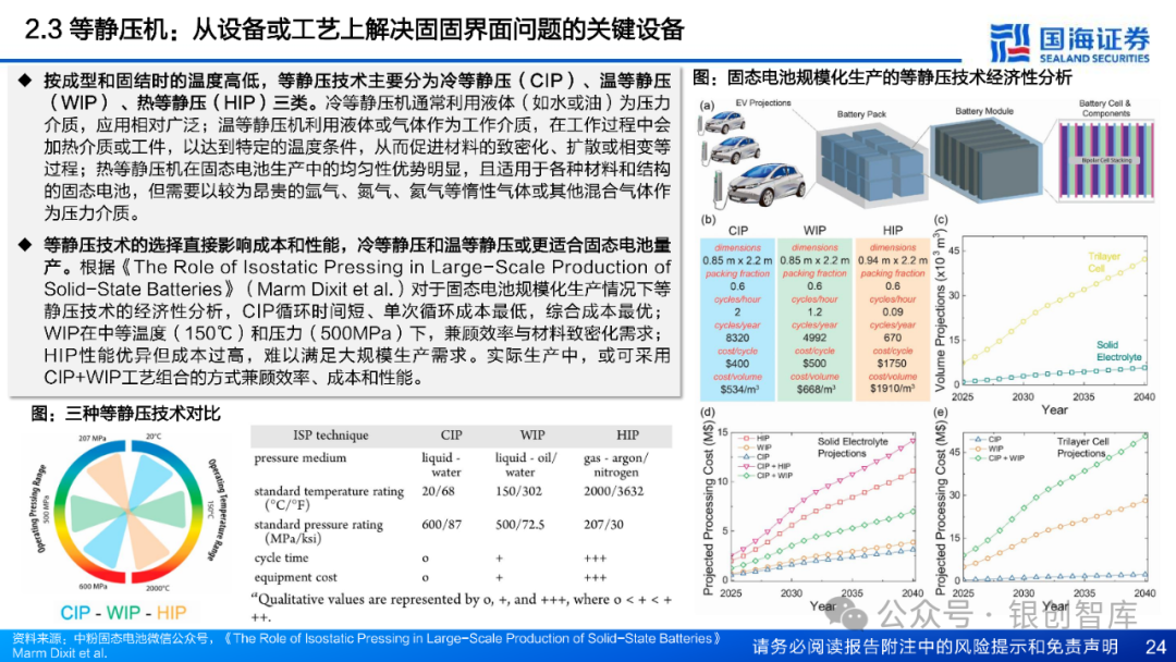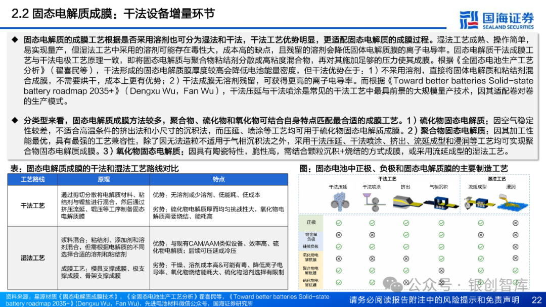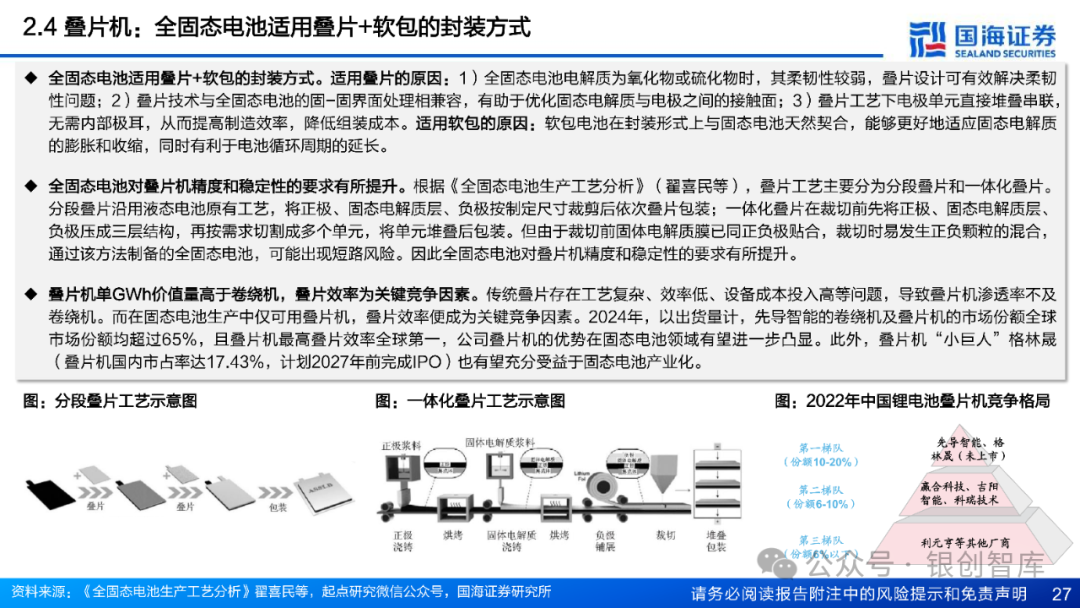 1)干法电极设备:a.纤维化:粘结剂纤维化法成本低、产品性能高,有望成为干法工艺的主流方案。b.辊压:在干法电极工艺下,可应用于电极成膜和热复合,应用场景得到拓宽;干法工艺对辊压机的工作压力、辊压精度及均匀性提出更高要求。 2)固态电解质制膜设备:干法工艺优势明显,亦为干法设备增量环节。其中干法压延与干法喷涂技术更匹配硫化物电解质膜的大规模量产。 3)等静压机:从设备或工艺上解决固固界面问题的关键设备。等静压工艺致密化均匀性、一致性优势明显,且尤其适用于硫化物固态电解质层的成型,当前多被用于固态电芯堆叠后的一体化压制和固态电解质膜的制备。 4)叠片机:从工艺成熟度、效率、成本等方面考虑,叠片是最适合全固态电池的装配工艺,电池封装方式适用软包。a.叠片机单GWh价值量高于卷绕机,叠片效率为关键竞争因素;b.全固态电池对叠片机精度和稳定性的要求有所提升。