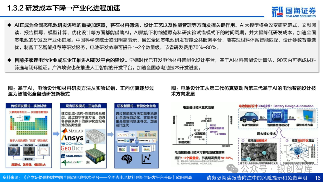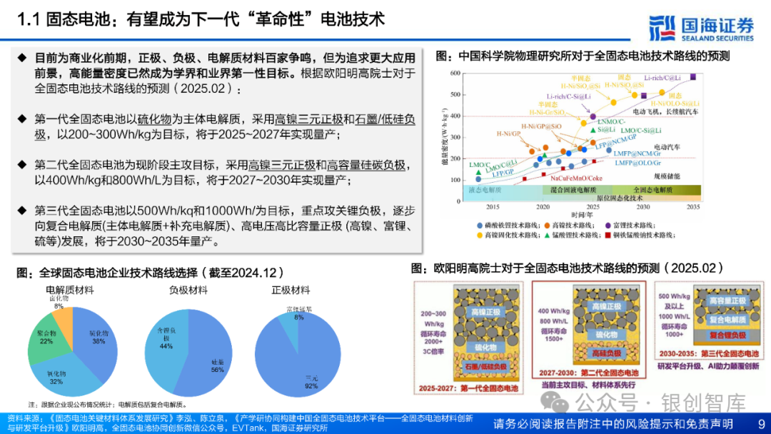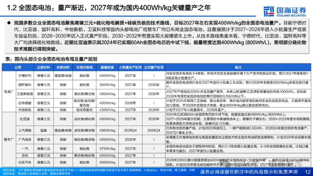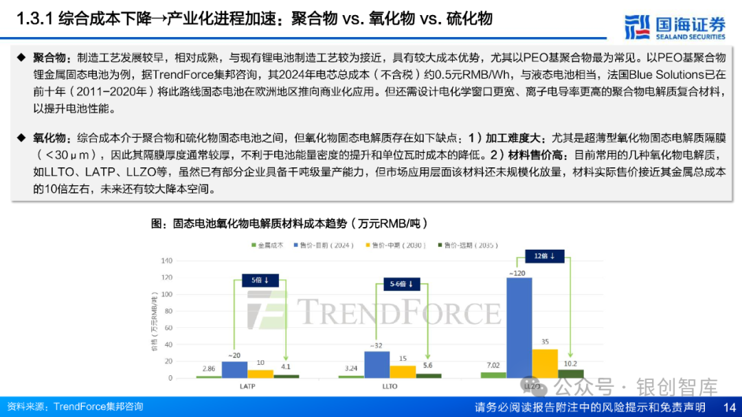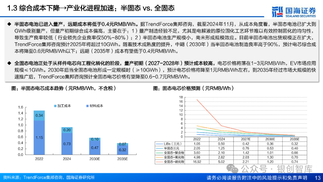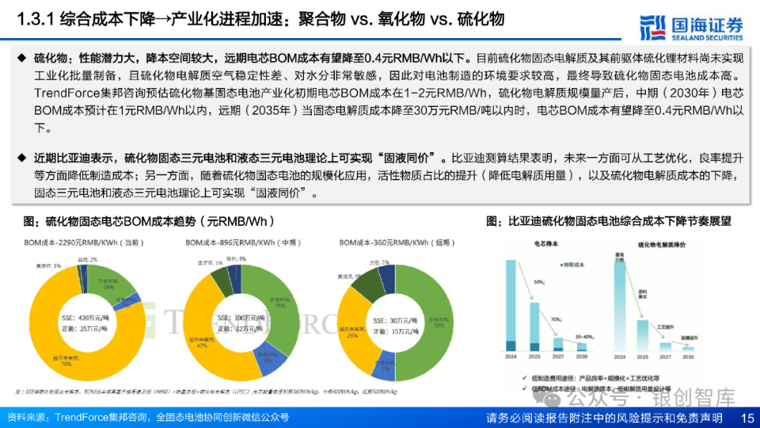 1)目前我国多数企业全固态电池聚焦高镍三元+硫化物电解质+硅碳负极的技术路线,根据欧阳明高院士,2027年左右将实现400Wh/kg的全固态电池量产目标。 2)从成本角度看,全固态电池量产初期综合成本偏高,但随着原材料降本、工艺优化、良率提升、制造规模的扩大,TrendForce集邦咨询预计2030年后全固态电池电芯价格将降至1元RMB/Wh左右,2035年有望降至0.6-0.7元RMB/Wh。其中比亚迪认为硫化物固态三元电池和液态三元电池理论上可实现“固液同价”。