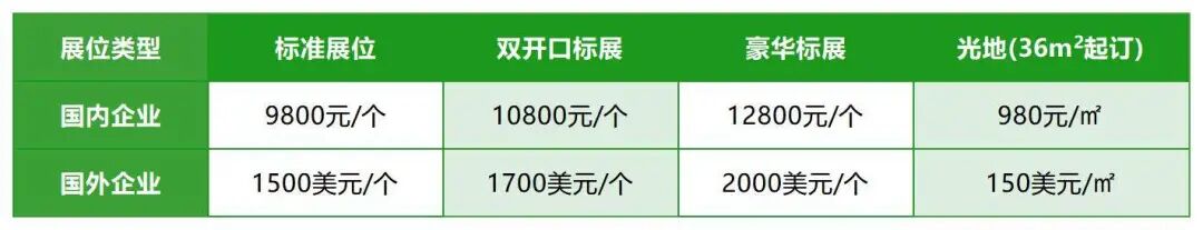 注: A. 标准展位配备:展位地毯铺设、中英文双语楣板字、咨询桌一张、折椅两把、射灯或日光灯两个、220V插座一个。