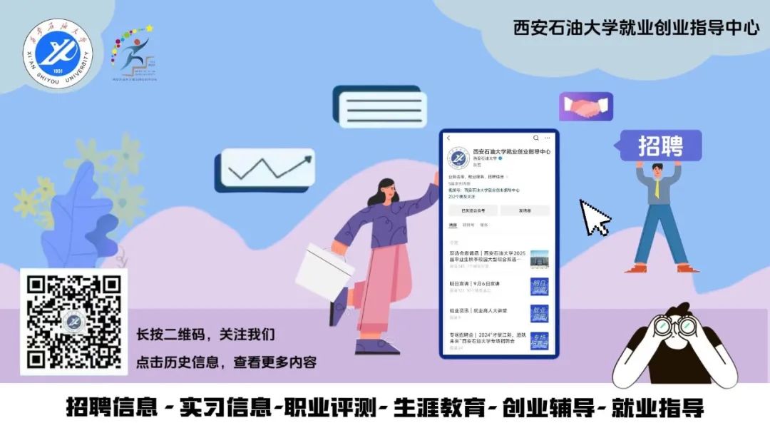 编辑:马欣磊校对:李敏洁审核:陈 杰往期推荐1.校园招聘 | 中兴微电子2025届校园招聘2.校园招聘 | 格力电器2025届春招——网申通道已开启3.校园招聘 | 远度科技2025校园招聘正式启动4.校园招聘 | 成都劳恩普思科技2025校园招聘西安石油大学就业创业指导中心微信公众号系信息发布平台,仅提供信息分享服务,点击阅读原文即为原创出处,如涉及侵权,请联系我们删除,谢谢!