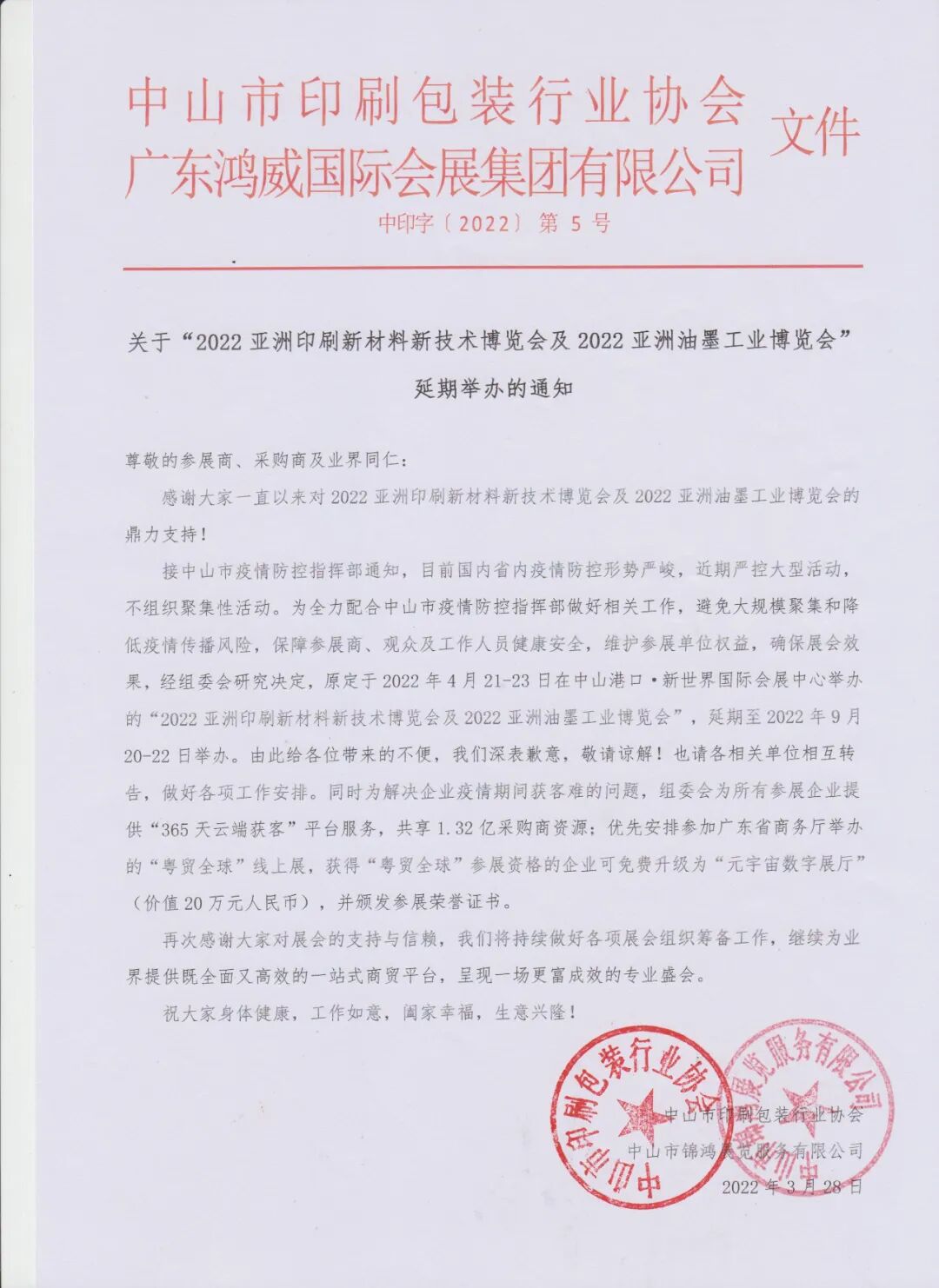 关于“2022亚洲印刷新材料新技术博览会及2022亚洲油墨工业博览会”延期举办的通知