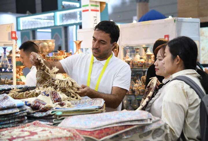 2024年9月20日,在陕西省西安市举行的第八届丝绸之路国际博览会上,来自伊朗的参展商(左一)向观众介绍产品。新华社记者 张博文 摄