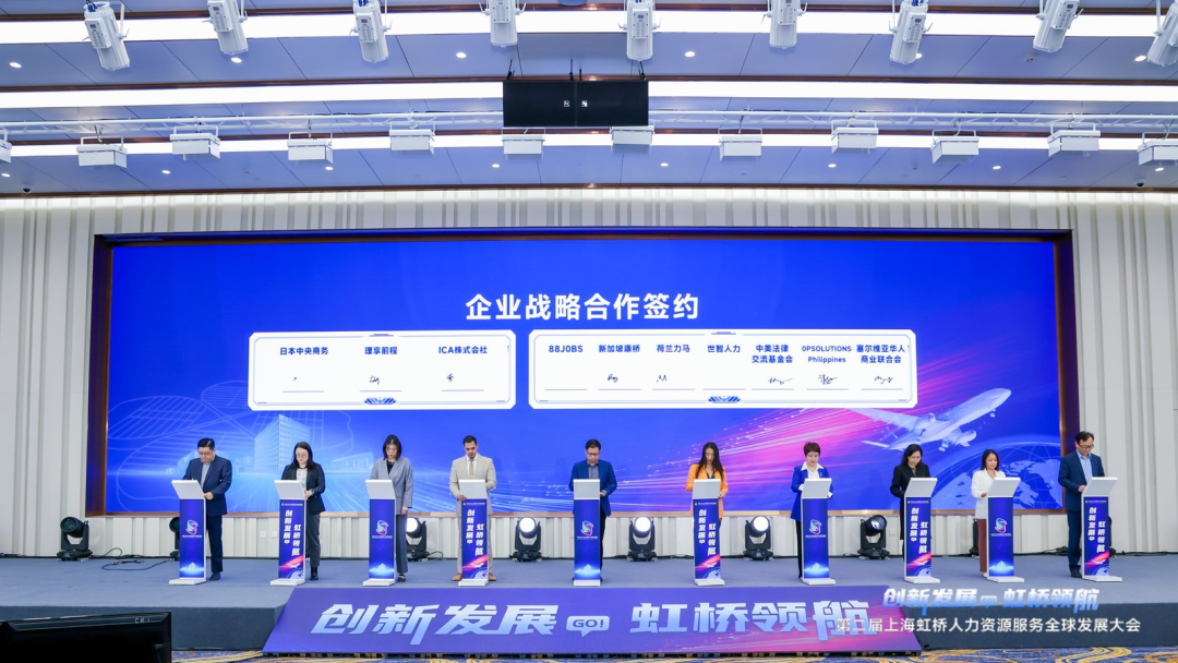 2024年11月8日在虹桥会议中心举行的上海虹桥人力资源服务全球发展大会上,依托中国上海人力资源服务产业园虹桥园区打造的特色服务品牌——“HQTP国际人才会客厅”今年再次走进进博会,携手园内10家行业龙头人力资源机构,集中展示了跨境人才服务解决方案和人力资源服务的新产品、新技术、新模式,致力于打造全球人力资源综合服务平台,形成全球人力资源汇聚。通过搭建人力资源服务供需双方互联互通的桥梁,将发挥人力资源服务市场化、专业化优势,构成综合性、国际化、多元化的人力资源生态服务系统。虹桥人力资源全球服务发展大会的指导单位为上海市人力资源和社会保障局、上海虹桥国际中央商务区管理委员会、上海市闵行区人民政府;主办单位为上海市闵行区人力资源和社会保障局、上海南虹桥投资开发(集团)有限公司;承办单位为中国上海人力资源服务产业园虹桥园区。当天大会,重磅发布了虹桥人力资源服务赋能企业出海计划。据了解,虹桥人力资源服务赋能企业出海计划涵盖涉及中企出海的8大类56项一站式、全场景、高质量的专业人力资源服务和落地支持,将为中国企业出海入华提供坚实的人力资源支撑载体。在会上,SGET世智人力分别与荷兰、法国、新加坡、美国、菲律宾和塞尔维亚等多国企业方代表共同签订战略合作协议。嘉宾们共同见证了这一重要时刻的到来。SGET世智人力通过与国际组织企业携手战略合作,不断深度融入全球人才链、产业链和创新链,在新的起点上实现更高质量的发展,更好地提升人力资源服务全球化服务能力。
