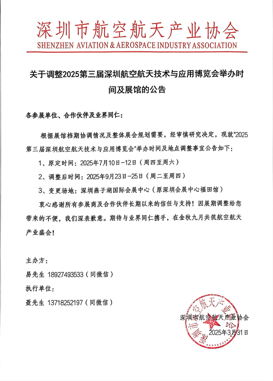 关于调整2025第三届深圳航空航天技术与应用博览会举办时间及展馆的公告
