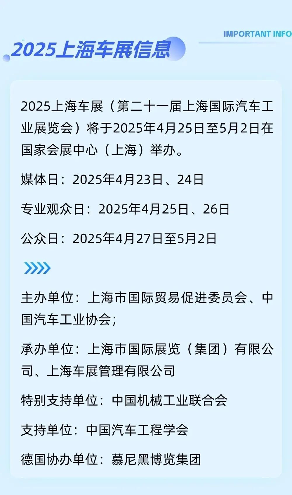2025上海车展(第二十一届上海国际汽车工业展览会)将于2025年4月25日至5月2日在国家会展中心(上海)举办。