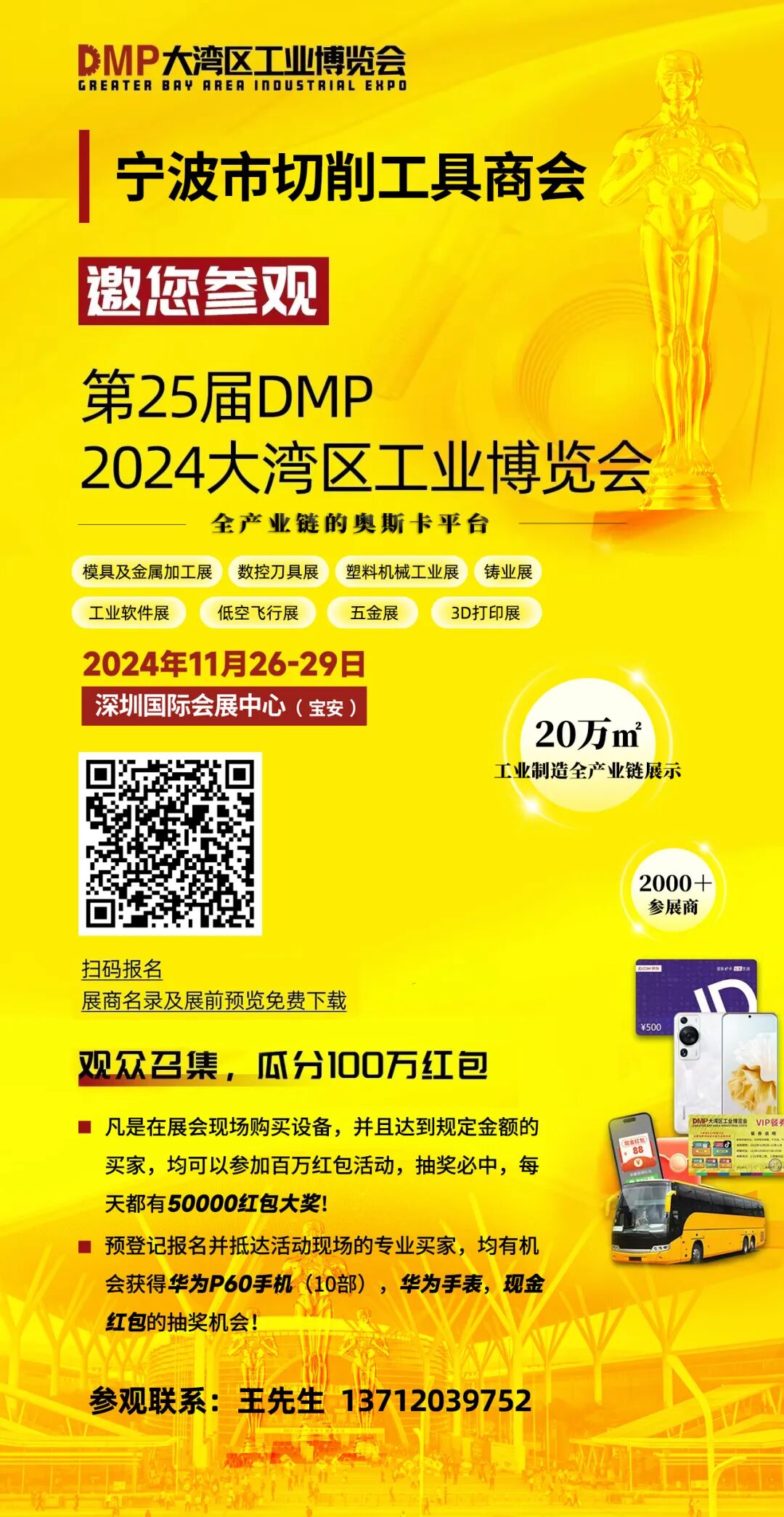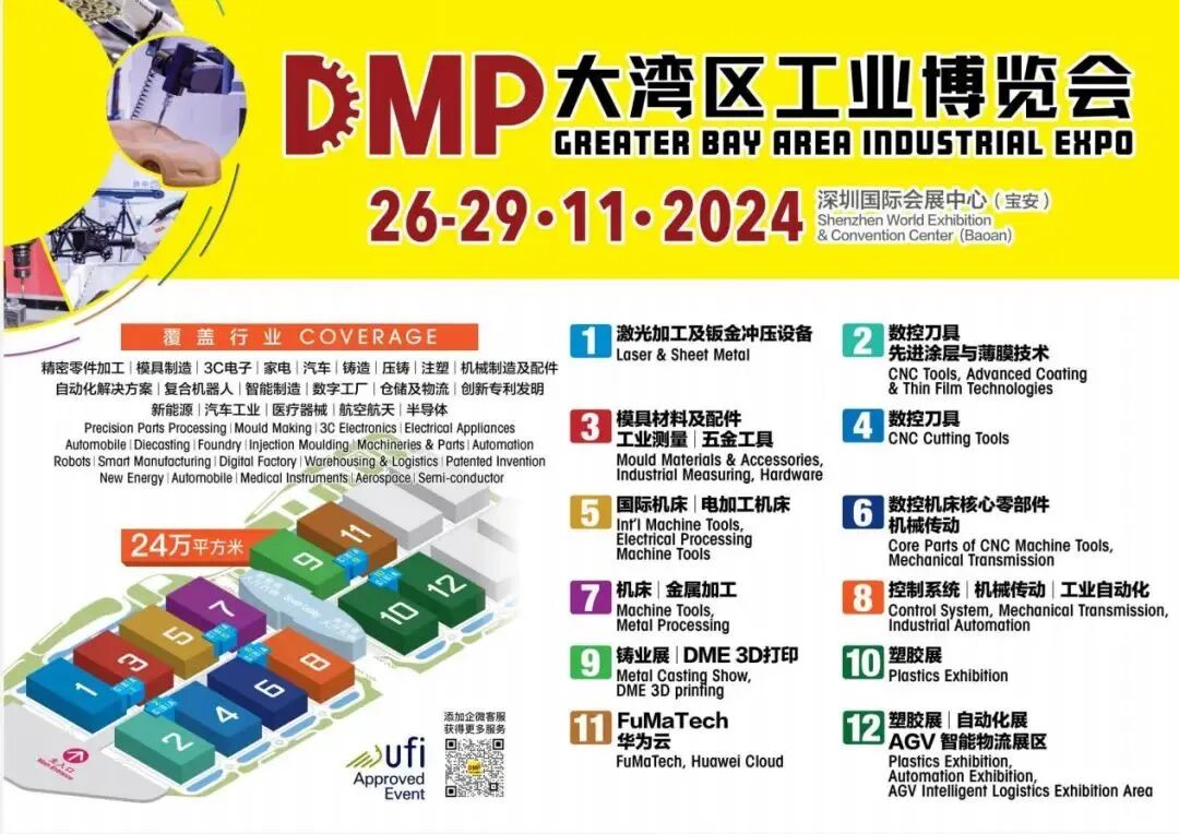 2024年DMP大湾区工博会即将于11月26日在深圳开幕,展会现场设置12大展馆,8大展区,覆盖数控机床、自动化及机器人、机械传动、压铸及铸造、精密注塑、模具制造、五金工具、工业软件、低空产业等多个领域的新成果、新应用,展示来自中国、德国、韩国、日本、美国、瑞典、法国、意大利、瑞士、荷兰、马来西亚、澳大利亚等国家和地区的10000余件创新展品,助力新能源、医疗器械、汽车工业、航空航天等行业企业实现降本增效、高质量发展。诚邀大家亲临体验,寻找最前沿科技解决方案。