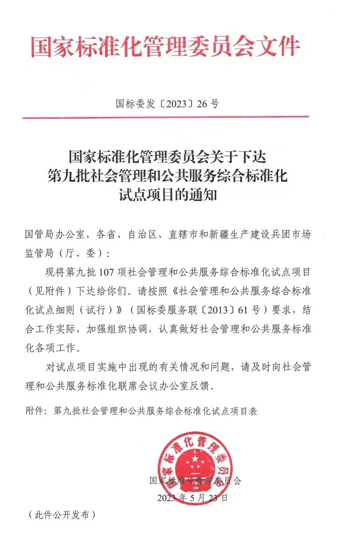 2023年5月,推动“中国国际贸易促进委员会商业行业委员会营商环境监测与企业综合服务标准化试点”入选九批社会管理和公共服务综合标准化试点项目(备注:全国共107项),领域为公共服务(营商环境)。这是全国贸促系统首次获批国家级社会管理和公共服务综合标准化试点。