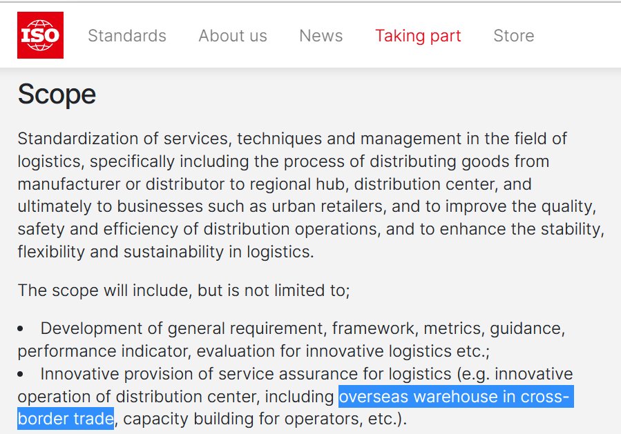 2023年6月,成功推动将海外仓纳入国际标准化的技术领域范围。ISO批准成立了由中国承担秘书国的国际标准化组织创新物流技术委员会(ISO/TC 344),其范围包括“跨境贸易海外仓(overseas warehouse in cross-border trade)”。