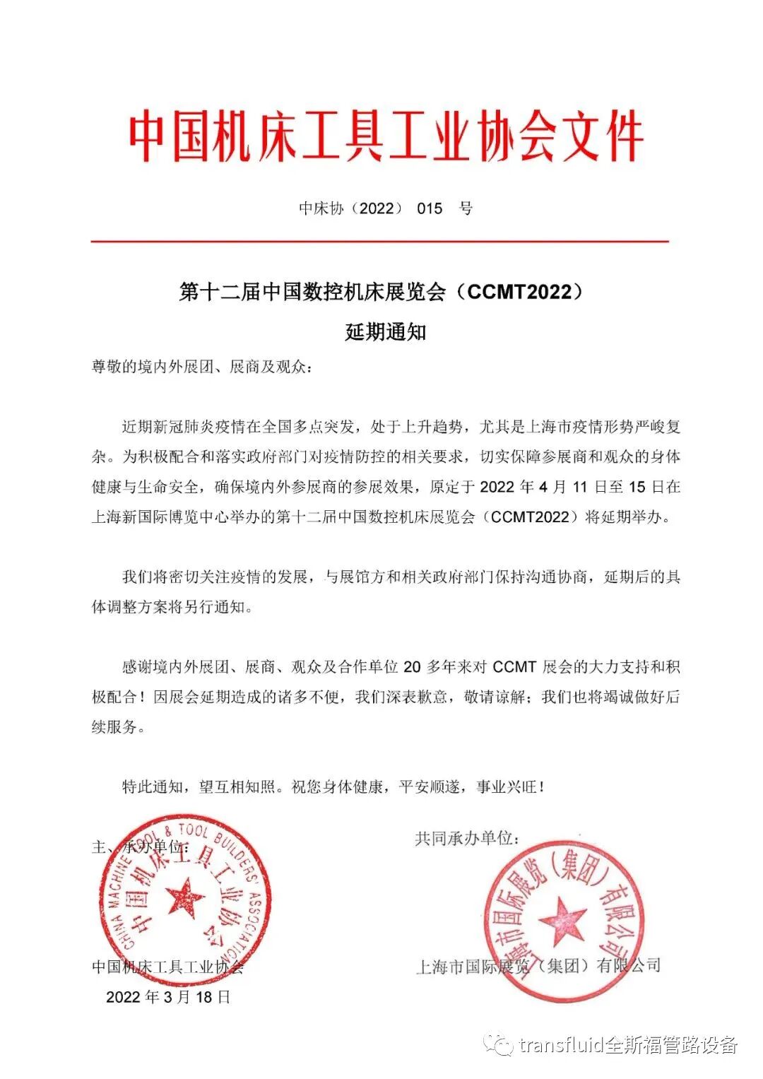 第十二届中国数控机床展览会(CCMT2022)延期通知 德国展团N1-A207 transfluid