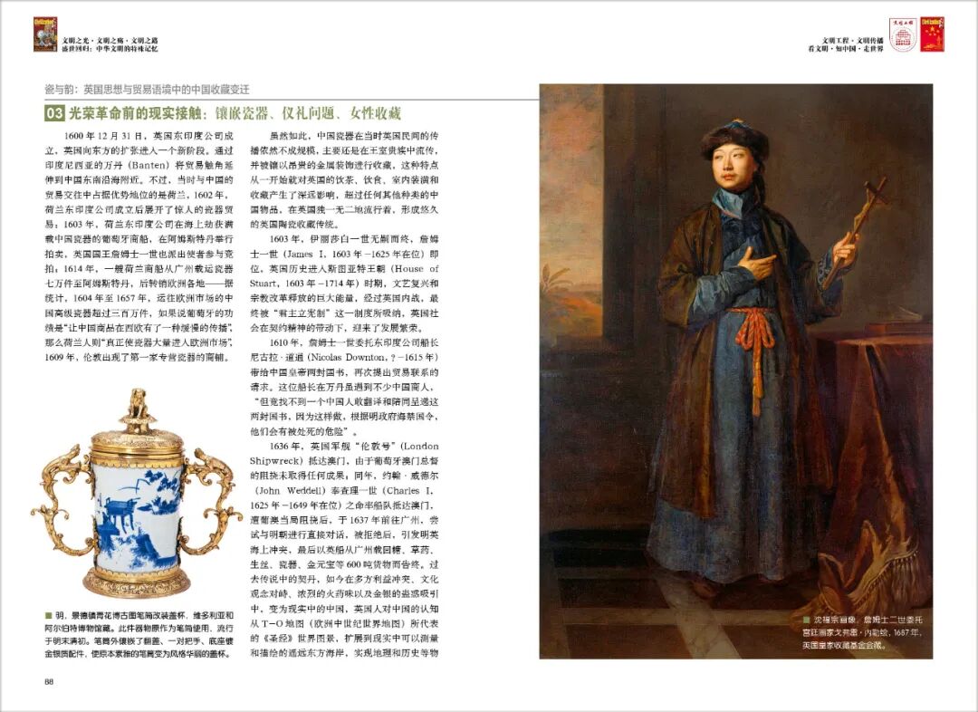 国王詹姆士二世亦是一位东方迷,不但前往牛津大学博德利图书馆询问汉籍书目的收藏情况,还委任宫廷画家为来自南京的教士沈福宗绘制了一幅画像。詹姆士二世对东方的热情,影响到他的女儿玛丽二世,她即位后在汉普顿宫的几间屋子里摆满了中国瓷器;在肯辛顿宫的一间房子里,154件瓷器(可能包括一些日本瓷器)被摆放在壁炉架、门框和窗户之间的架子上,其中有相当的比例都是康熙年间的外销瓷,品种包括青花、德化窑白瓷和康熙三彩,这些收藏使她得以跻身17世纪末英国几位女性瓷器收藏家之列,带动了英国社会各阶层尤其是女性对中国瓷器的消费欲望。